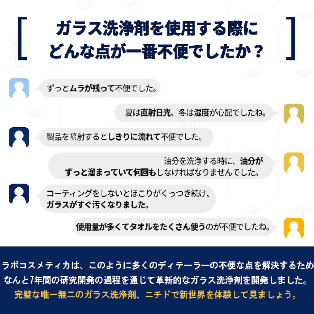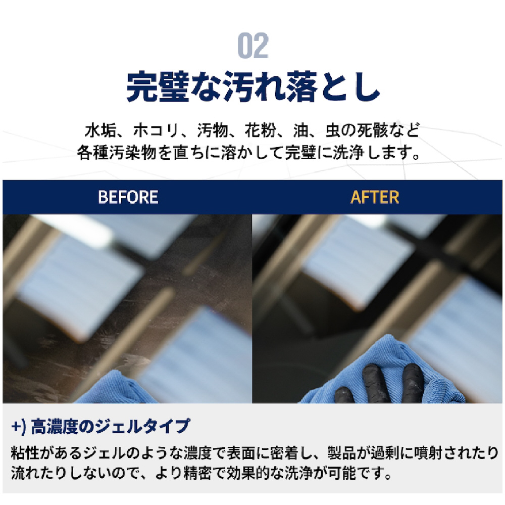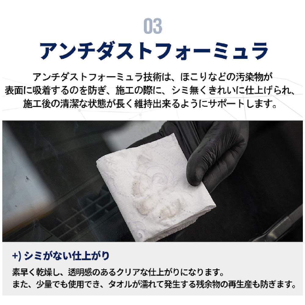 洗浄後の汚れの吸着を防止し、鮮明な視野を維持。汚れや油を迅速かつ徹底的に取り除き、目に見える微細な拭き筋が残りません。