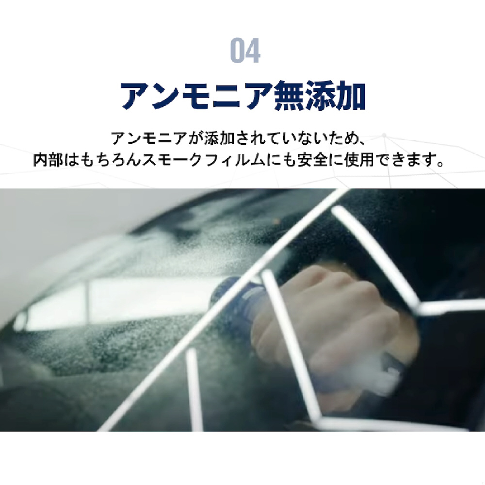 直射日光や熱い塗装面にも使えるガラスクリーナー。スプレー式で作業が簡単です。水垢、ホコリ、花粉、油など様々な汚染物を除去します。洗浄後の汚れの吸着を防止し、鮮明な視野を確保。素早くきれいに乾燥して、透き通って透明な仕上がりです。
