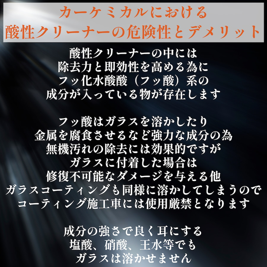 ガラスやコーティングにダメージを与えてしまうフッ酸不使用。