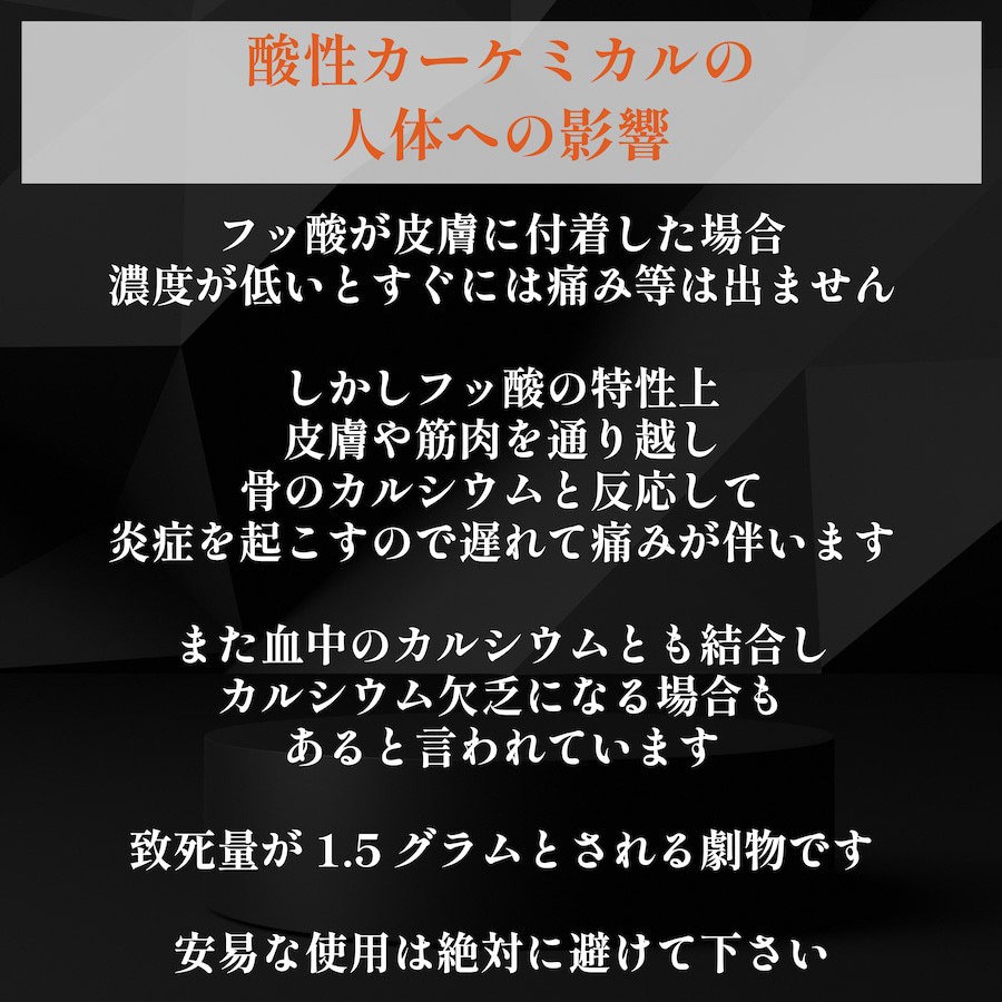 安全性と除去力を両立させた酸性クリーナー。湿式乾式どちらでも使用可能。泡立てての使用可能。ガラスやコーティングにダメージを与えてしまうフッ酸不使用。界面活性剤配合で、有機性の汚れも除去。