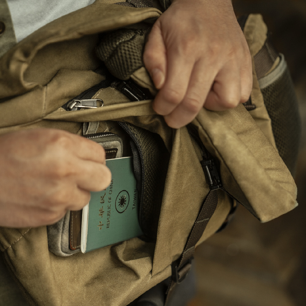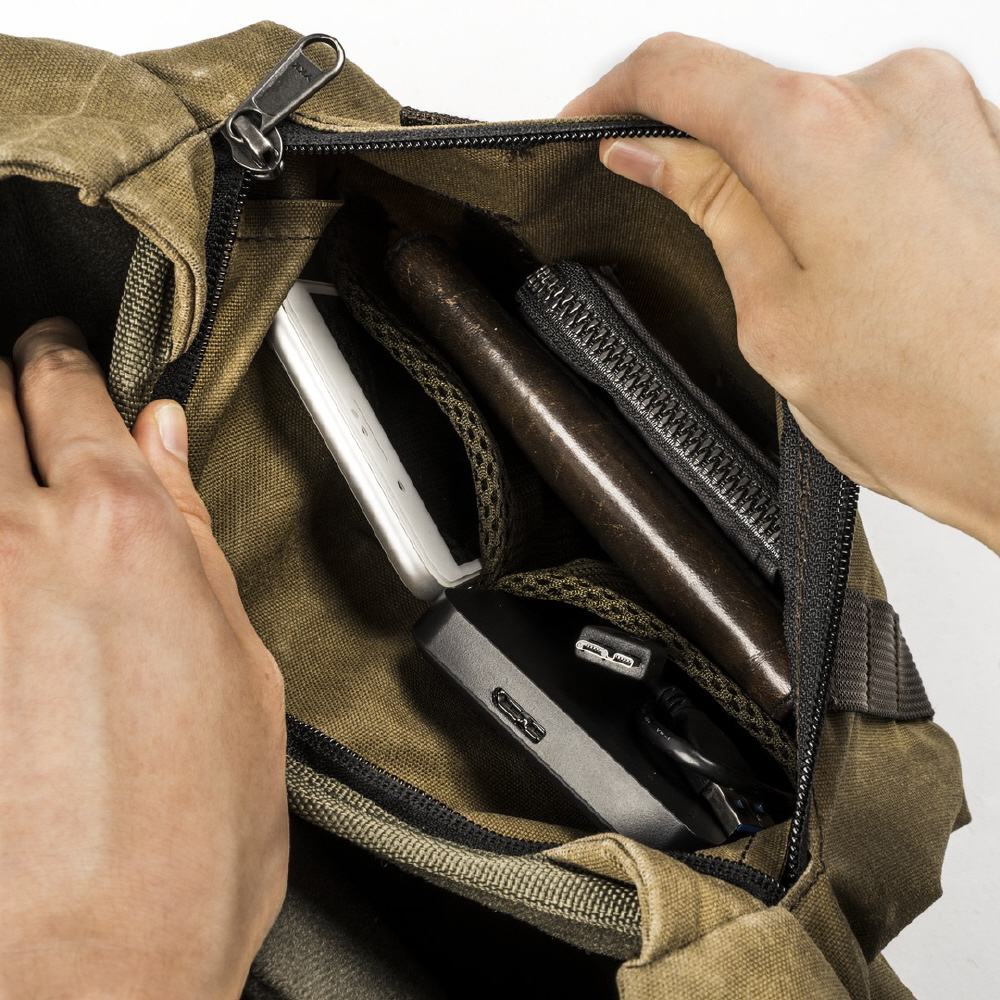チャックなしの大きい開け口デザインで機材を素早く取り出すことができます。チャックによる損害の心配もありません。ヴォータンクラフト独自開発の「三角形カバー」は、フラップを開けるとき邪魔せずまっすぐになります。閉めると自然に折り畳み、バッグ両サイドの隙間を防ぎます。雨やホコリなどの侵入を防止するうえ、バッグの中のものが落ちません。