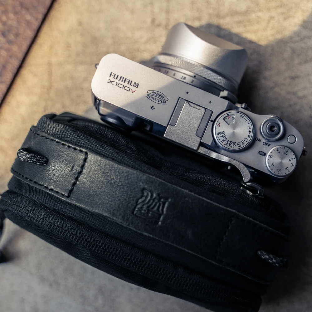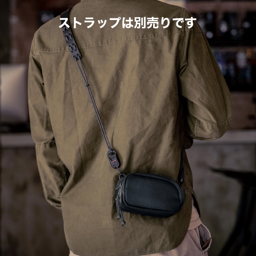 ポータブルカメラポーチにはストラップ取付用のループが2つあり、お好みのストラップを取り付けできます。別売りでヴォータンクラフトのネックストラップを取り付ければ、ポータブルカメラポーチをショルダーバッグとして使えます。