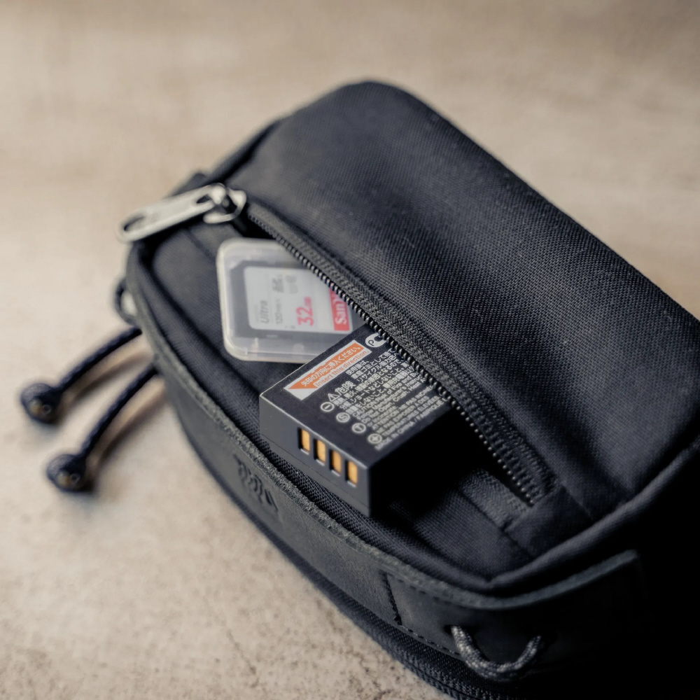 ポータブルカメラポーチの外側にはポケットがあり、メモリーカードやバッテリーなど小物を収納できます。