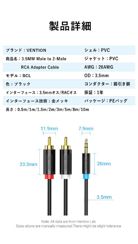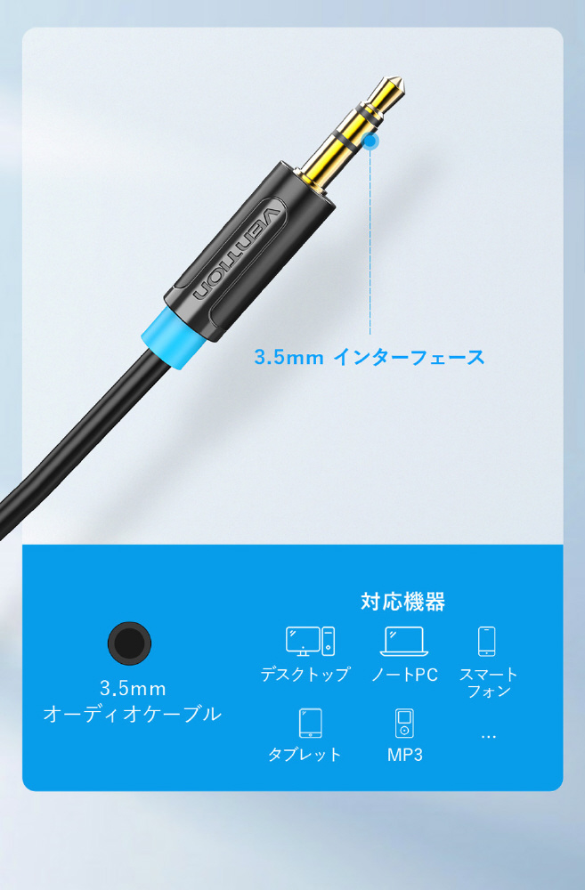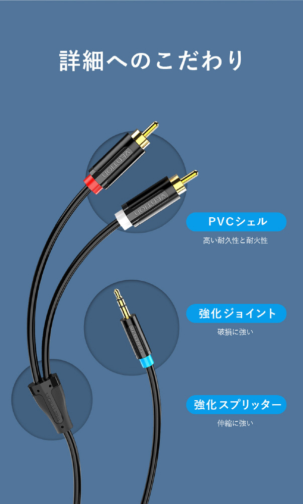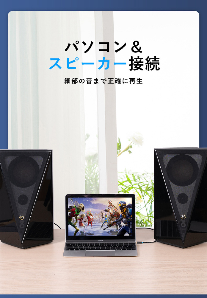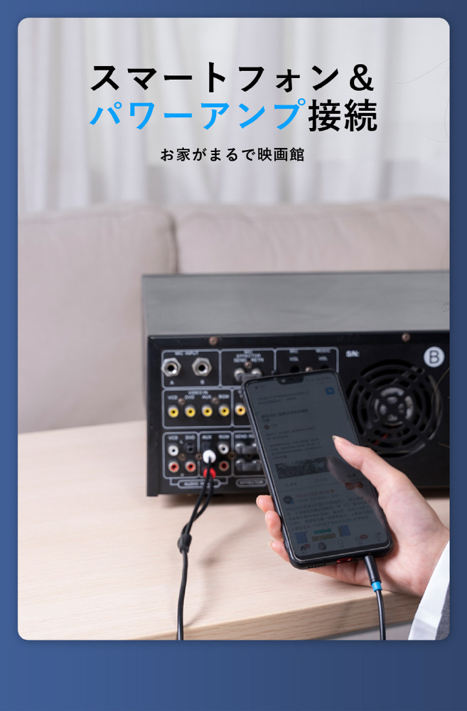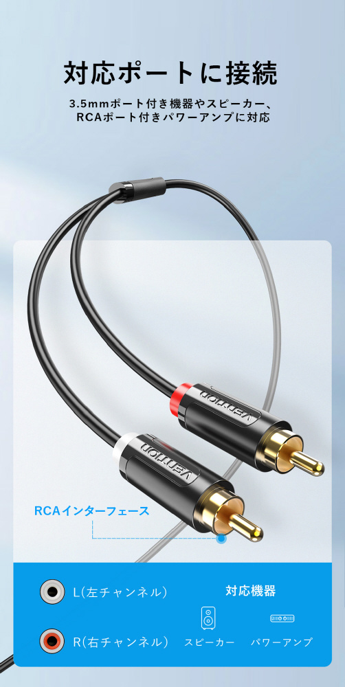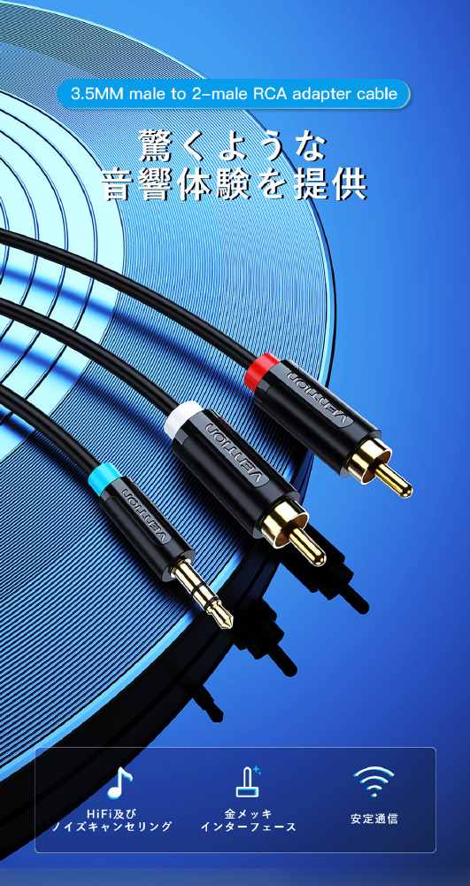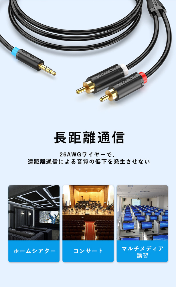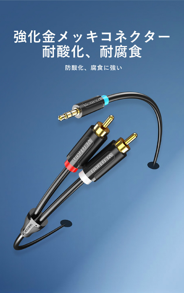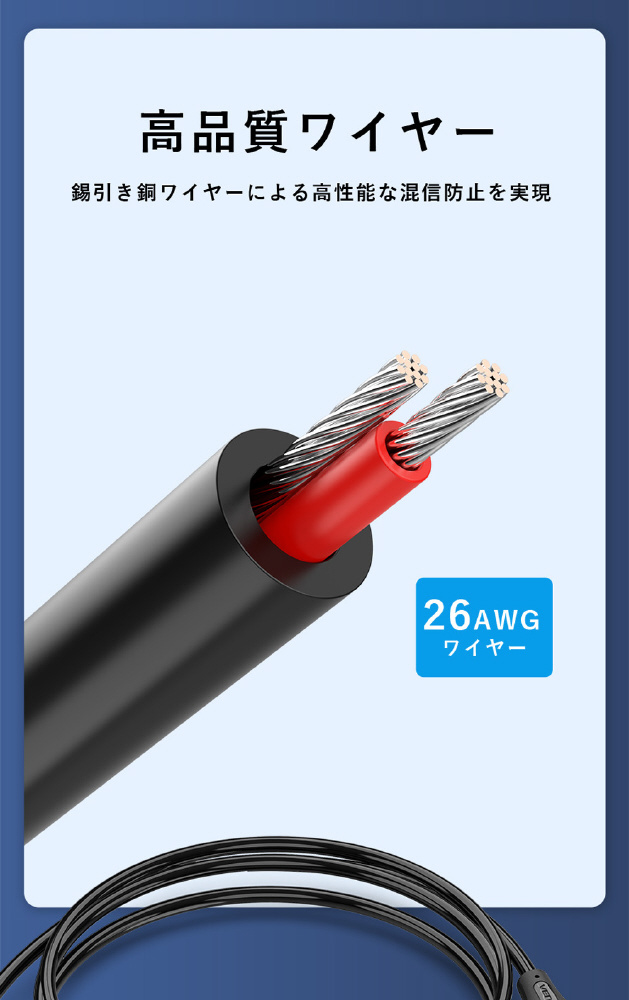 3.5mmポート付き機器やスピーカー、RCAポート付きパワーアンプに対応。ノイズや電子音知らずのクリアな音質。錫引き銅ワイヤーによる高性能な混信防止を実現。26AWGワイヤーで、遠距離通信による音質の低下を発生させない。