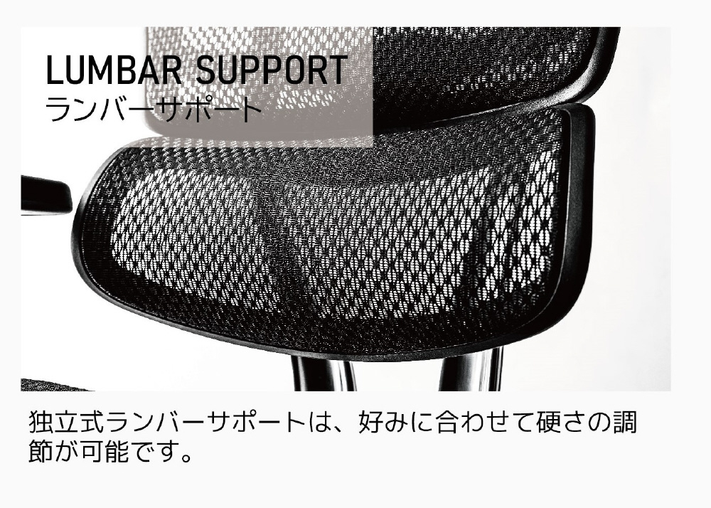 エルゴヒューマンの最大の特徴である”独立式ランバーサポート” 背面との一体型が主流だったランバーサポートを背面から独立させ、腰を独自にサポートするように設計しています。新シリーズではランバーサポート部の角度とテンションは背面から独立して個別に調節できるようになりました。