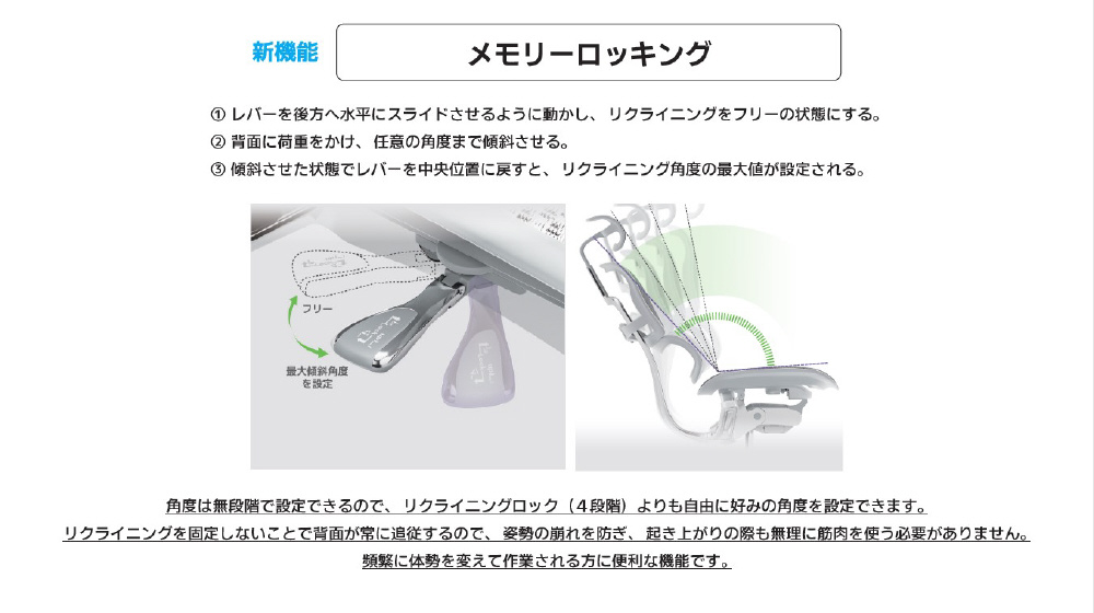 リクライニング時の最大傾斜角度を無段階で調整ができるようになりました。リクライニング時の角度の上限を設定することで、頻繁に体勢を変えて作業される方にオススメな機能です。