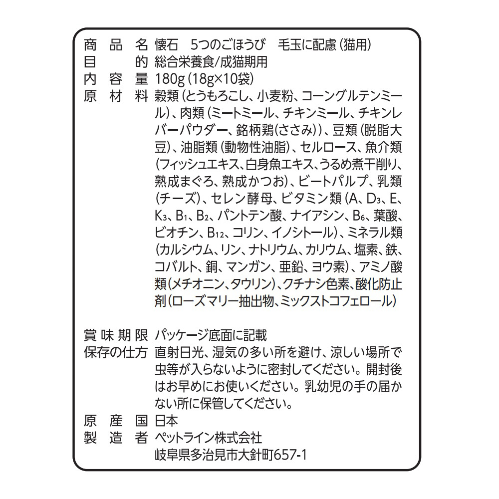 ・毛玉の排出に配慮して、ビートパルプ&セルロースを配合し、食物繊維を約50%アップ*。*懐石5つのごほうび深紅比