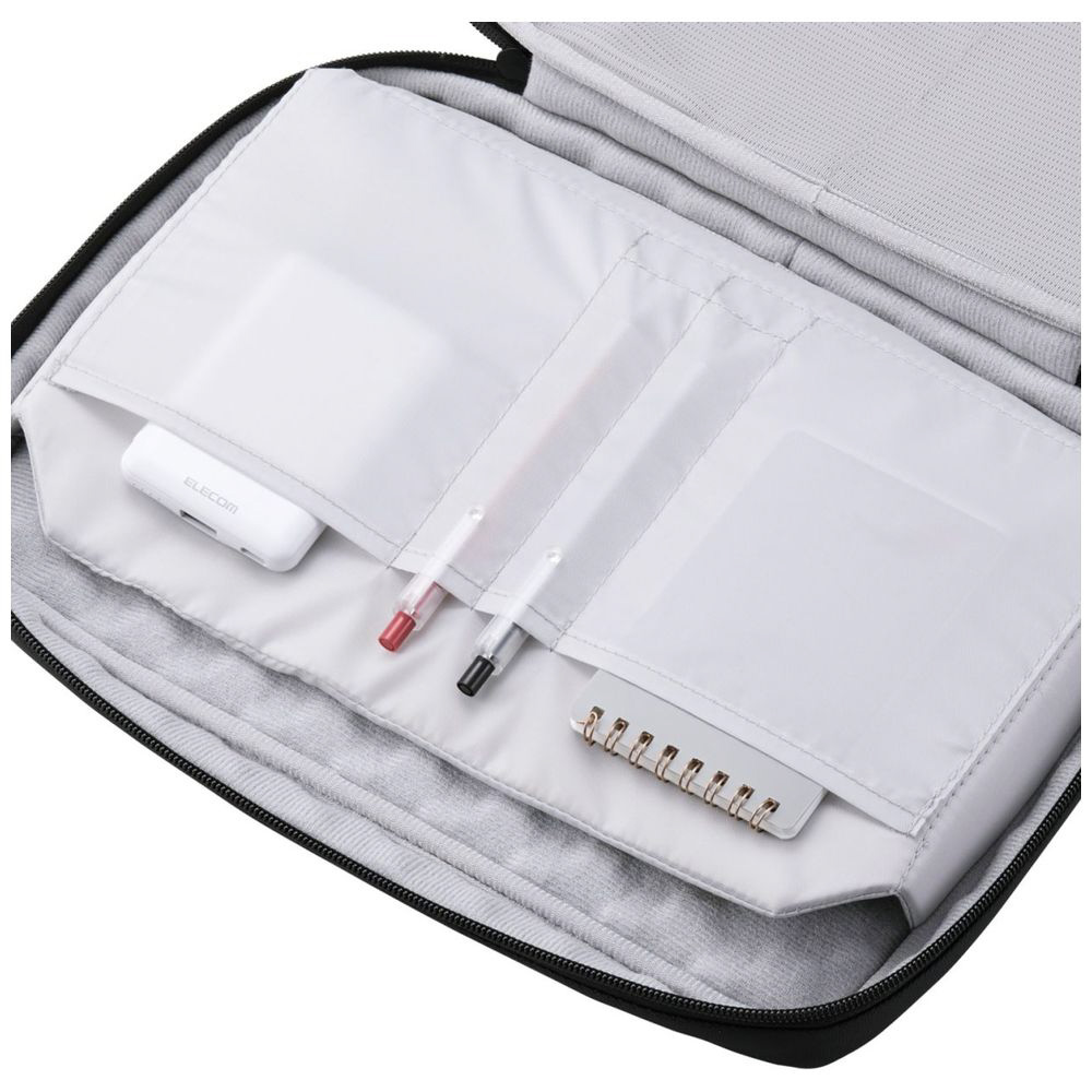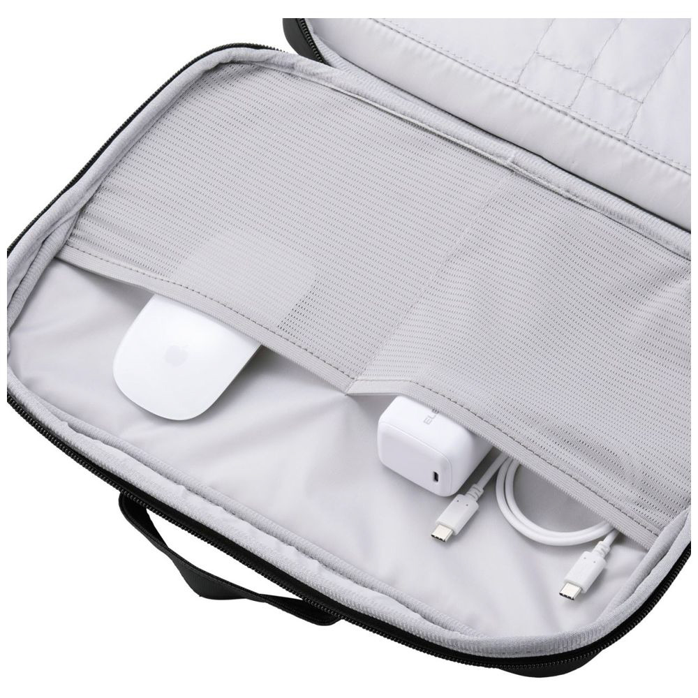 本体内装には、マウスやケーブルなどの周辺機器を整理して収納できるストレッチメッシュ素材のオープンポケットを2つ備えています。