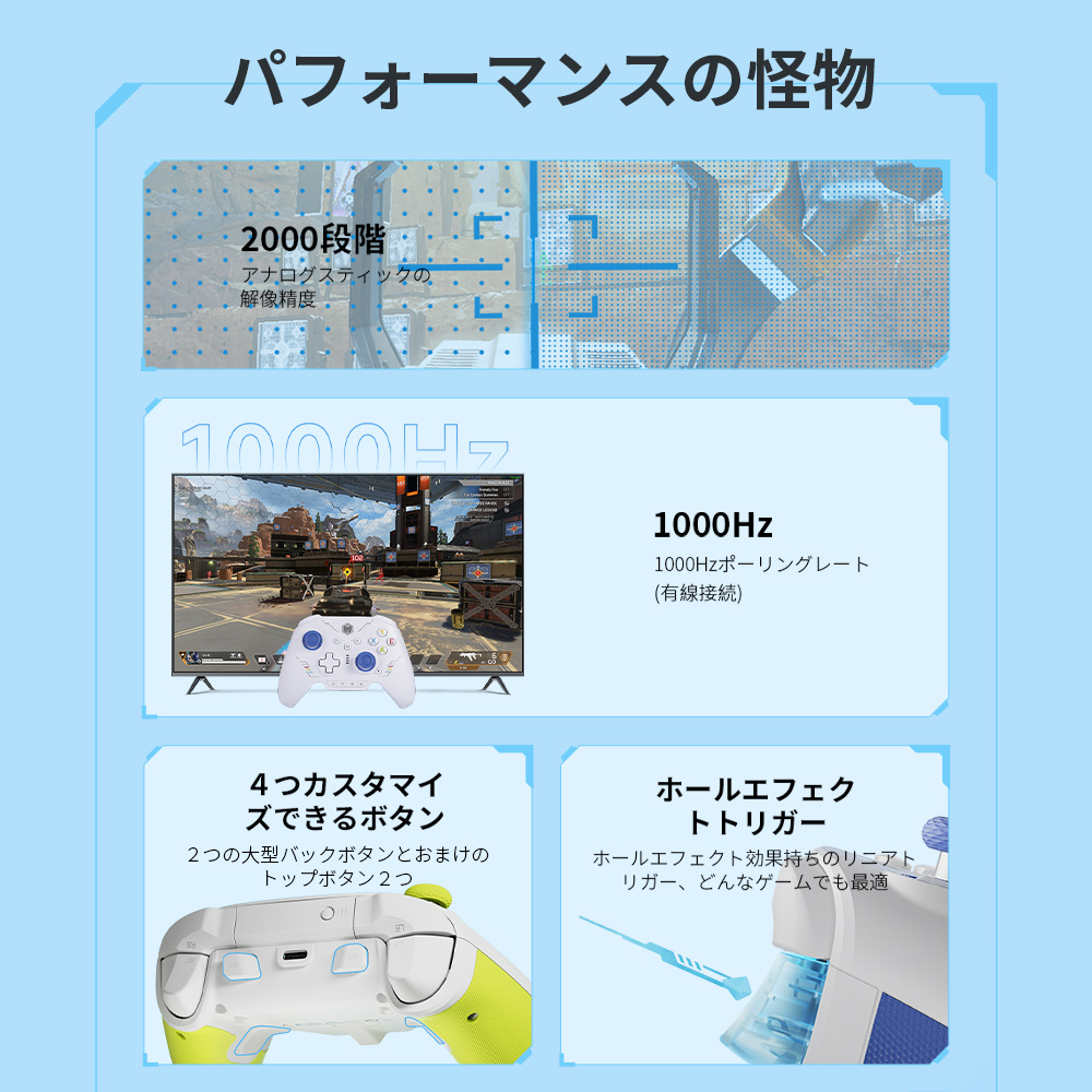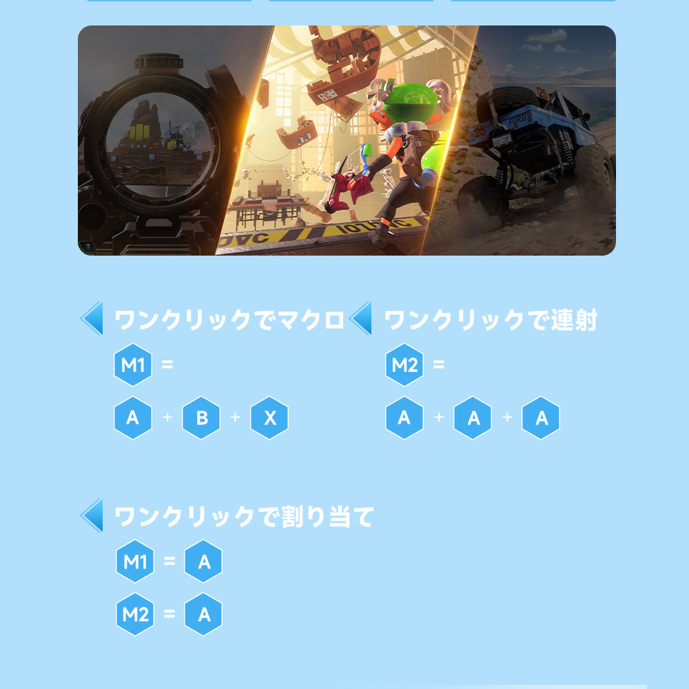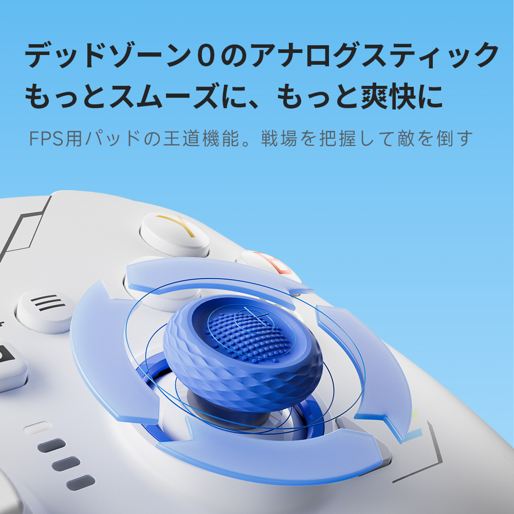 アプリを使用することで、ジョイスティック感度やデットゾーン設定、マクロ設定等が行え、付属品のジョイスティックや十字キーを取り換えることでより自分好みのコントローラーにすることが可能。