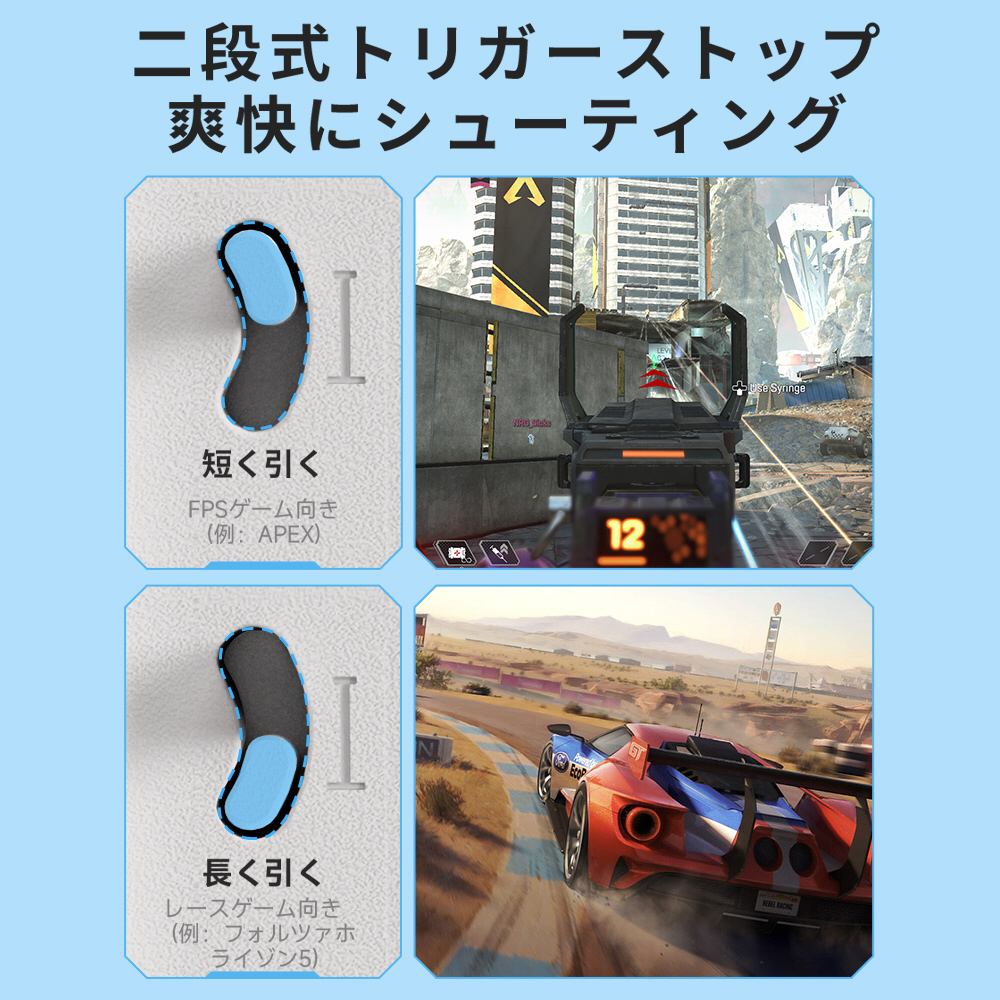 トリガーボタン(LT/RT)用にトリガーストップ機構を搭載し、プレイするゲームタイトルに合わせ簡単に調整が可能です。