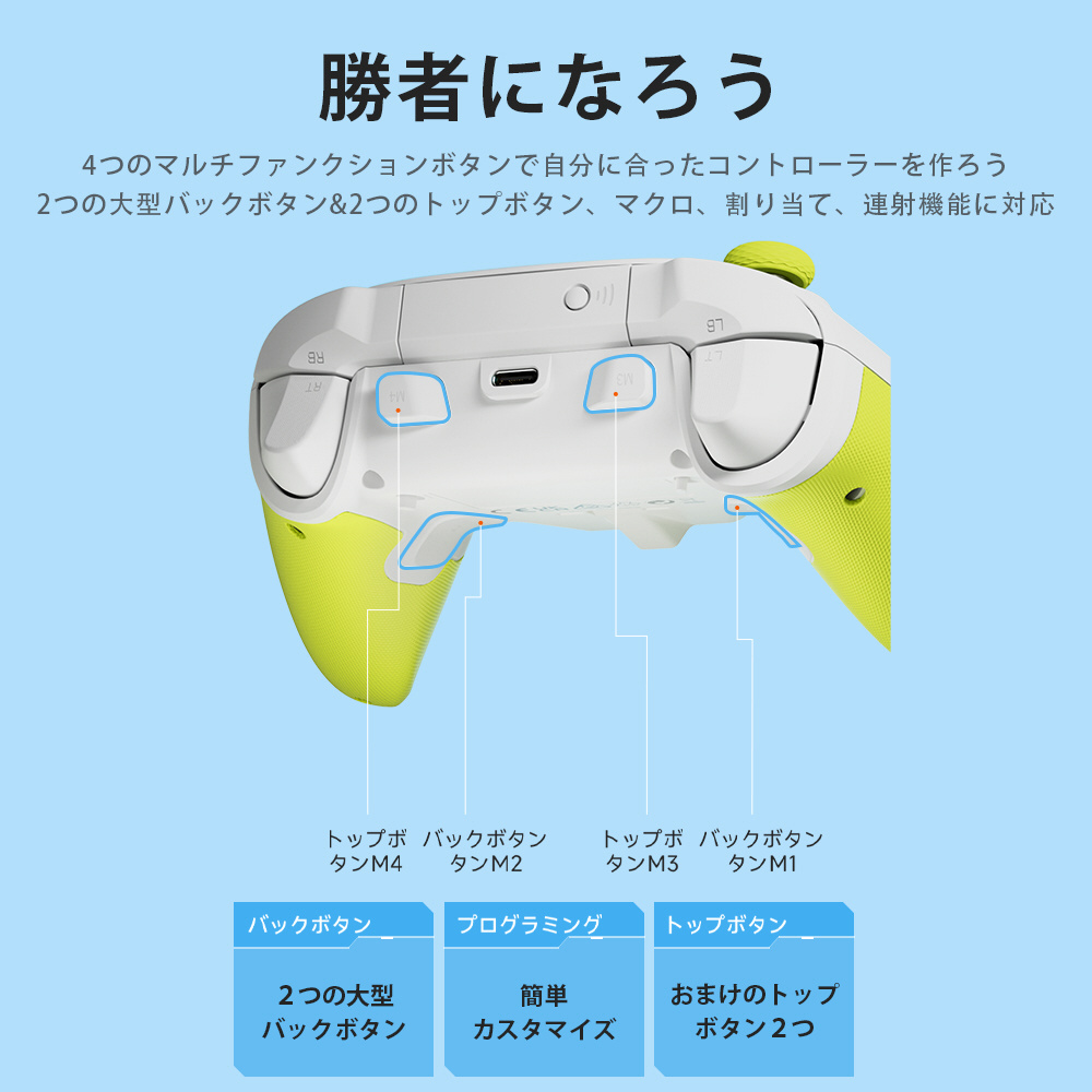 背面と前面に2個づつ、合計4個の追加ボタン。マクロや連射、マッピングに対応。