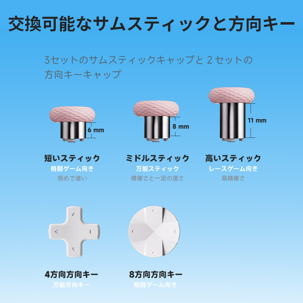 付属品 本体 x 1、USBケーブル x 1、2.4G USBドングル x 1、高さ違いのジョイスティック x 3種類、十字キー x 2種類、取扱説明書 x 1