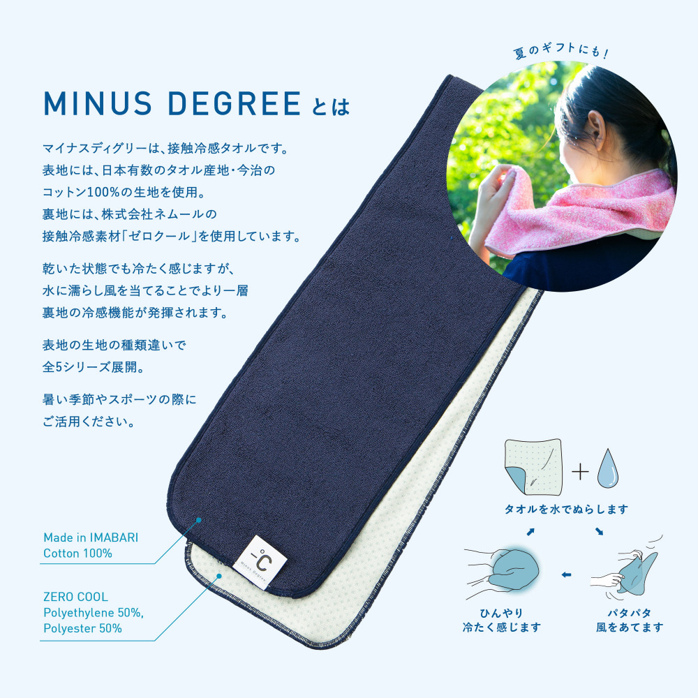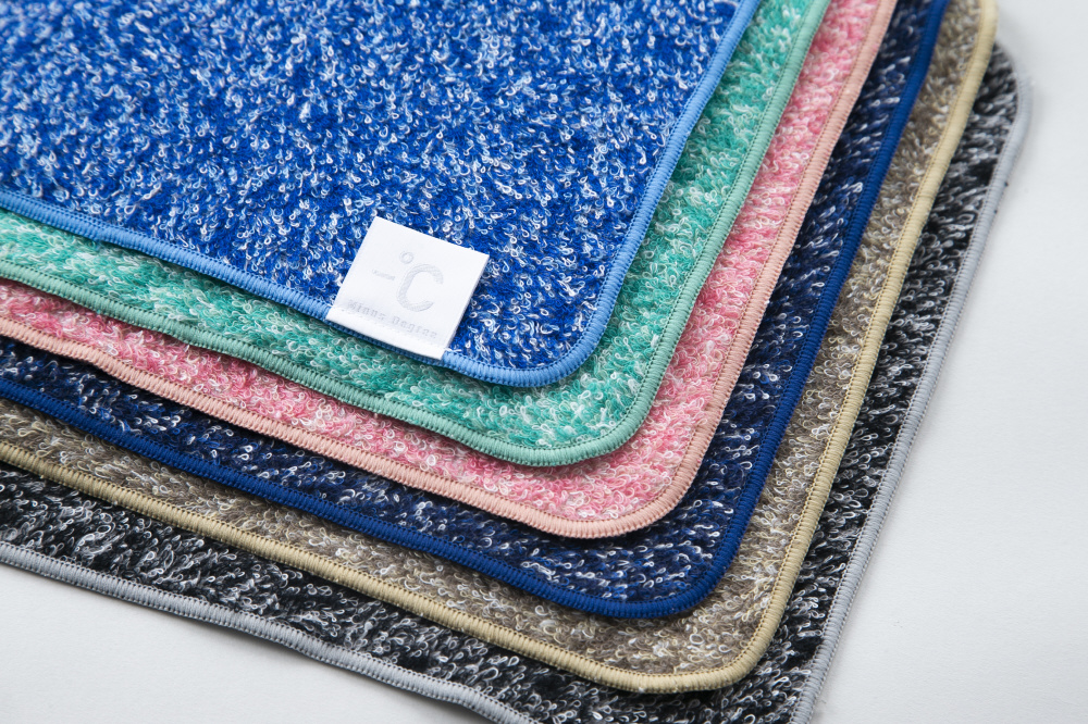 表地にはタオルの産地、今治の3色毛違いジャガード織りのパイル地を使用しPRIMEシリーズは6色展開、今までよりももう1段階グレードアップした質感と色味で男性のみならず女性にもご提案しやすいシリーズです。裏地にはネムール株式会社の接触冷感素材ゼロクールを使用。乾いた状態でも冷たく感じますが、タオルを濡らすことで、裏地の接触冷感機能がより発揮されます。裏地が温かくなってきても、タオルをパタパタして風を当てると冷たさがまた戻ります。暑い季節やスポーツの際にご活用ください。