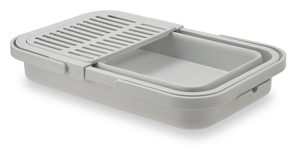 たたんでコンパクトに収納できるバスケットです。トレーは取り外しOK。清掃用品など小物のちょい置きに便利です。ヒモを掛けられるので吊り下げ収納ができ、その状態でお掃除道具の収納が可能です。便利な水抜き栓もついています。洗剤のちょい置き、清掃用品、緊急時の食器洗い、上履きの浸け置き洗い、車の洗車など使い道は様々です。【仕様】付属品:ちょい置きトレー●折りたたみ時サイズ:奥行28.6×幅46.3×高さ7.3cm●容量:15000ml