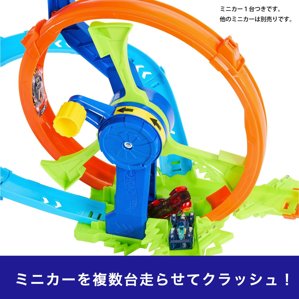 付属のミニカー(1台)と、別売りのホットウィールミニカーを複数台同時に走らせることも可能。