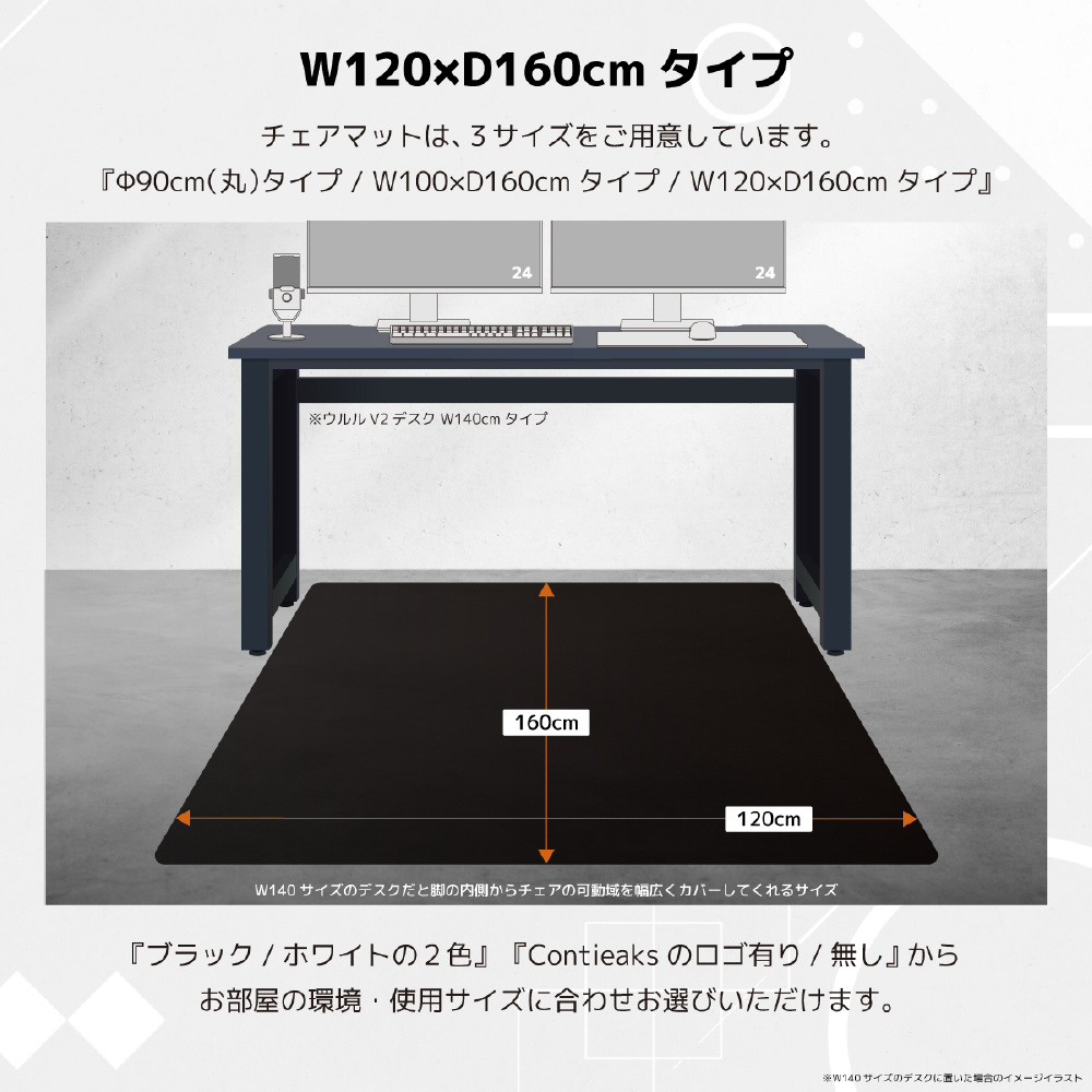 W120デスク脚部+チェア可動域までフルカバーできるサイズ。