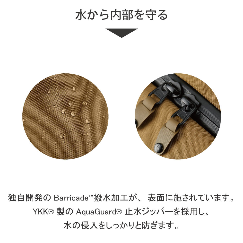 もともと水に強い生地を使用していますが、さらにBoundary Suppy独自のBarricade 撥水加工を施しています。