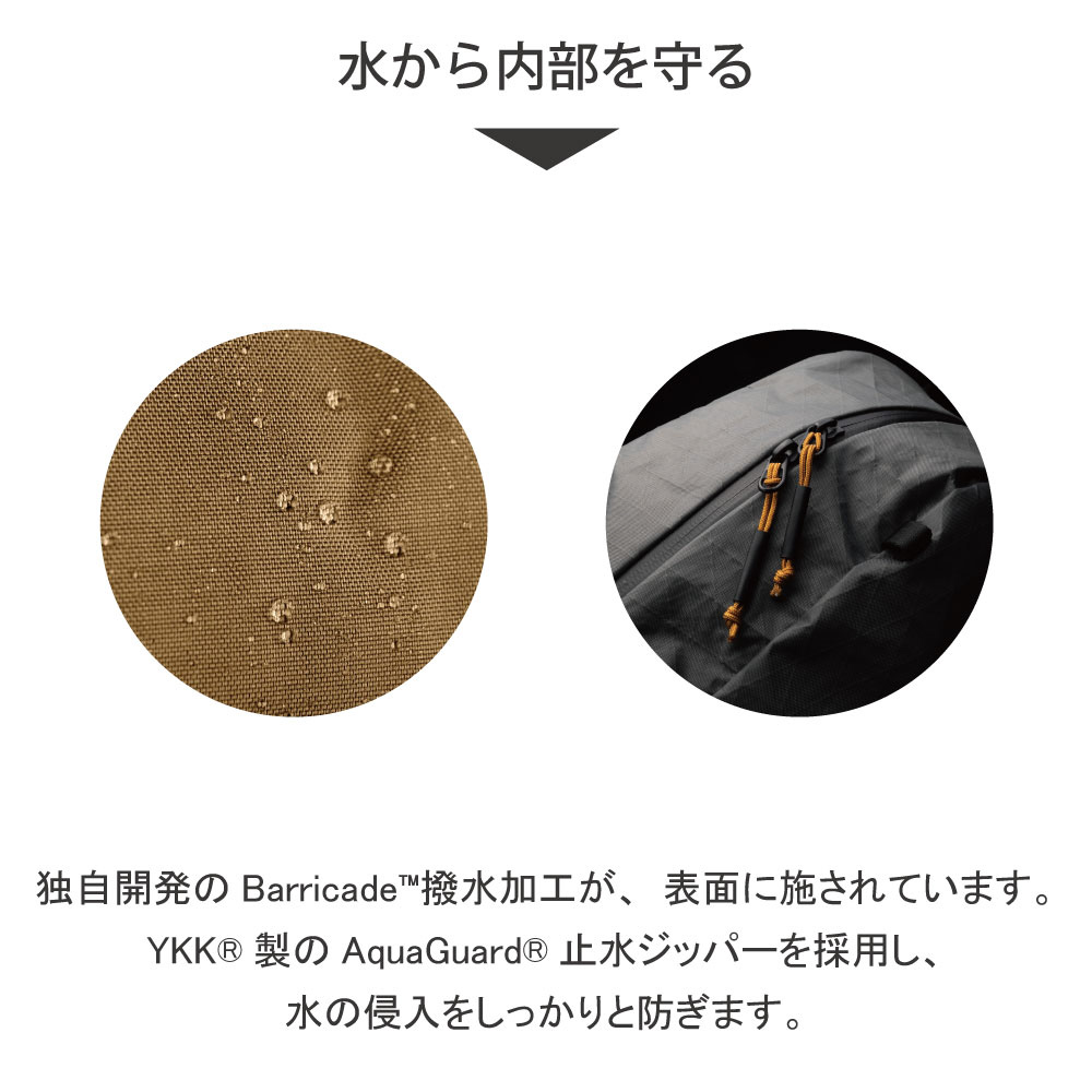 表面にはBarricade 撥水加工を施し、ジッパーにはYKK(R)AquaGuard(R)止水ジッパーを採用しました。