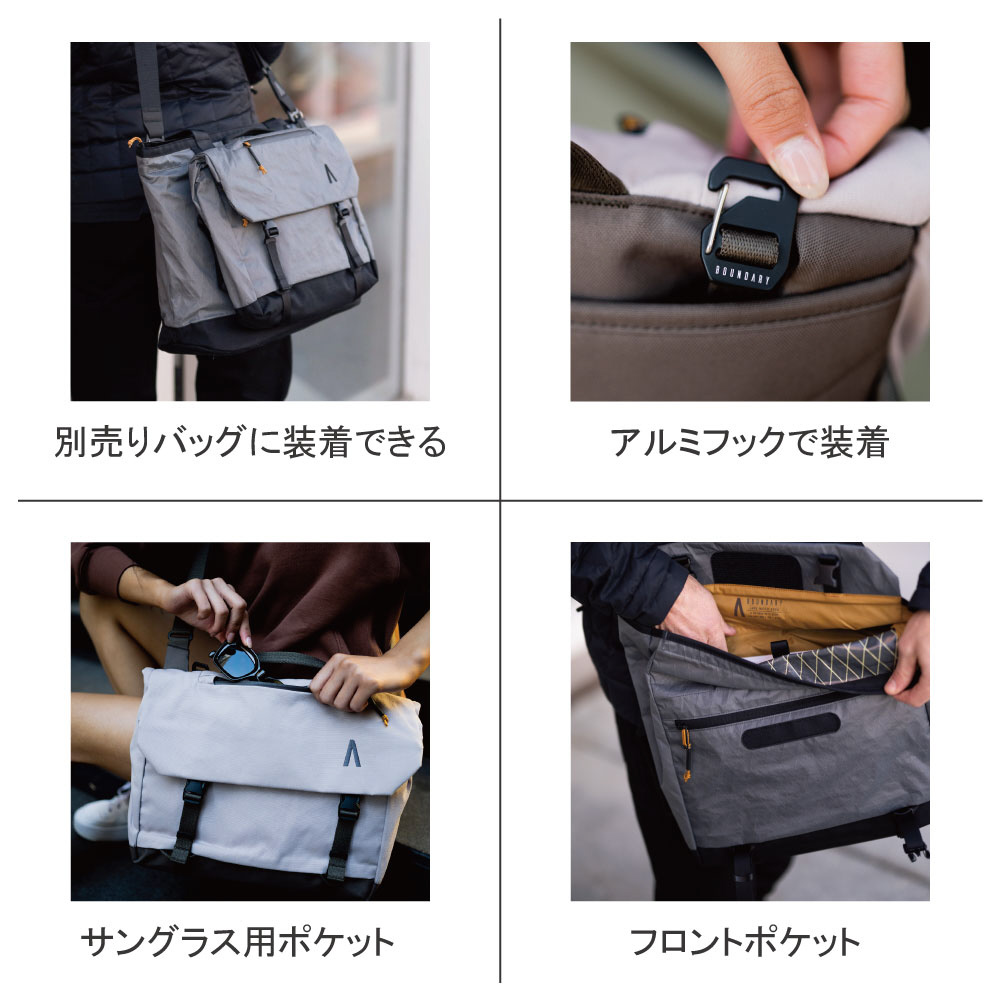 モジュラーとして別売りバッグに装着することもできるショルダーバッグ。独自開発のリサイクル生地を使用しています。撥水加工+止水ジッパーで、荷物を水からしっかりと守ります。