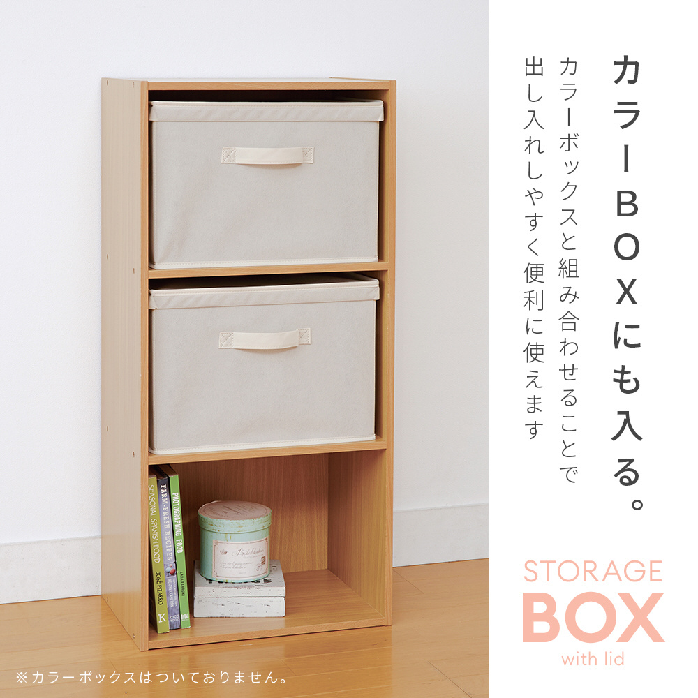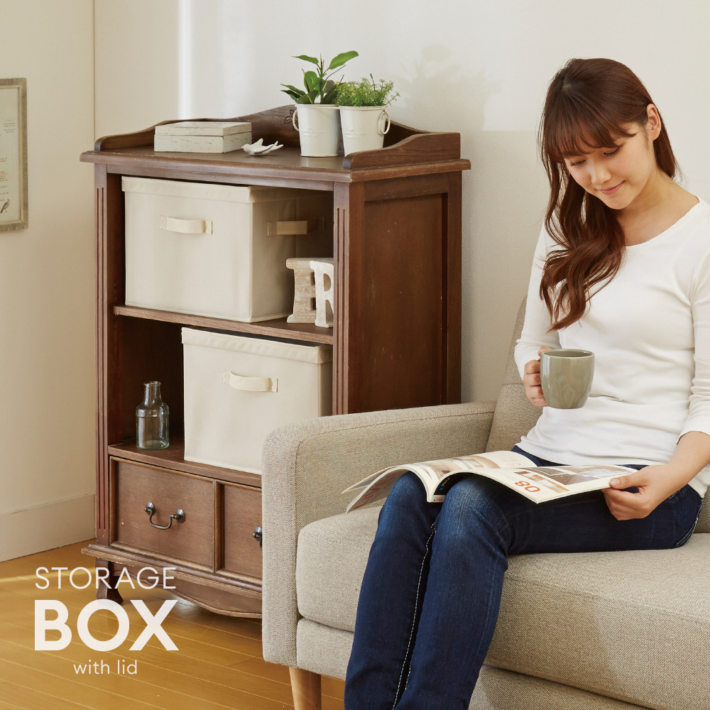 ホコリから中身を守るフタ付整理箱。衣類の整理や食品ストック、おもちゃの片付けなどに!カラーボックスにも入るサイズ。持ち手付きだから、取り出しやすく持ち運びにも便利!積み重ねても使用OK(3段まで・耐荷重:約5kg)。使わない時は折りたたんで、保管も省スペース。
