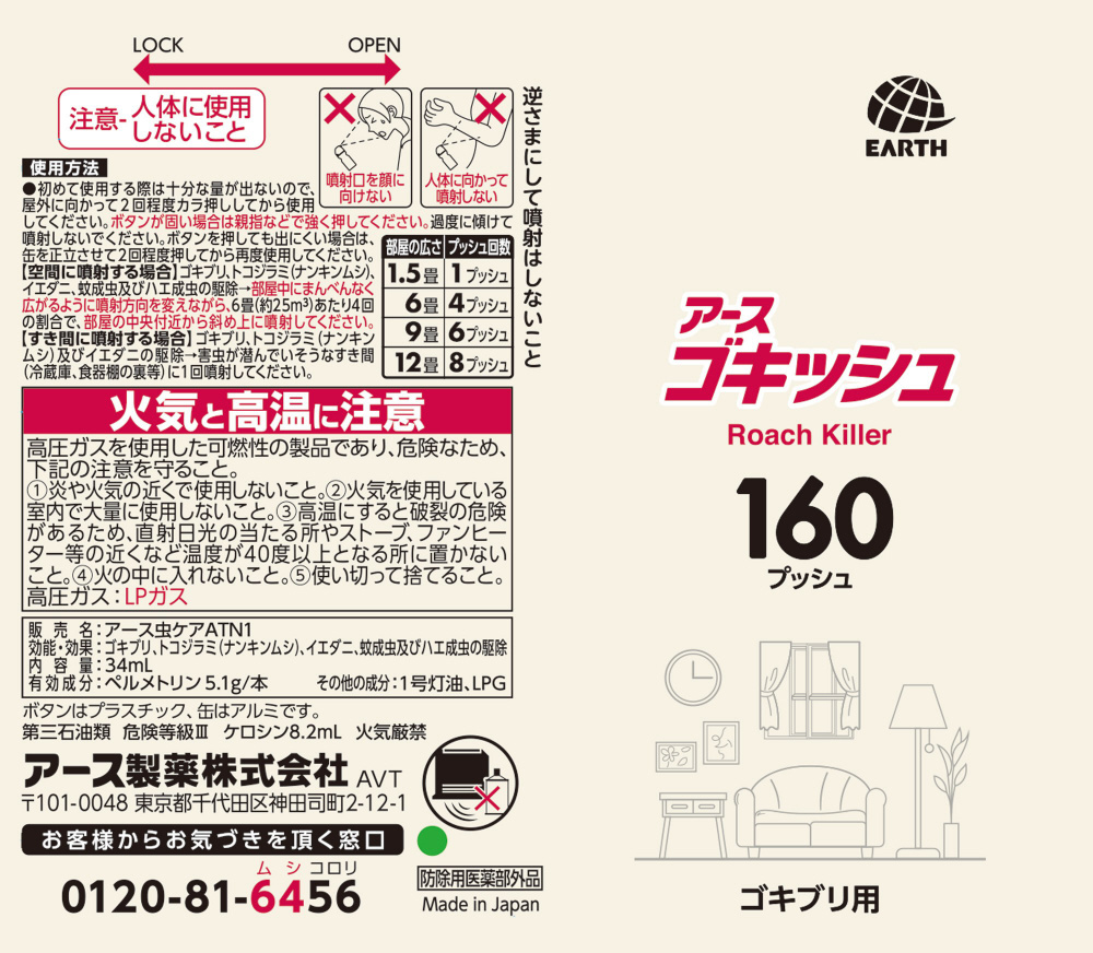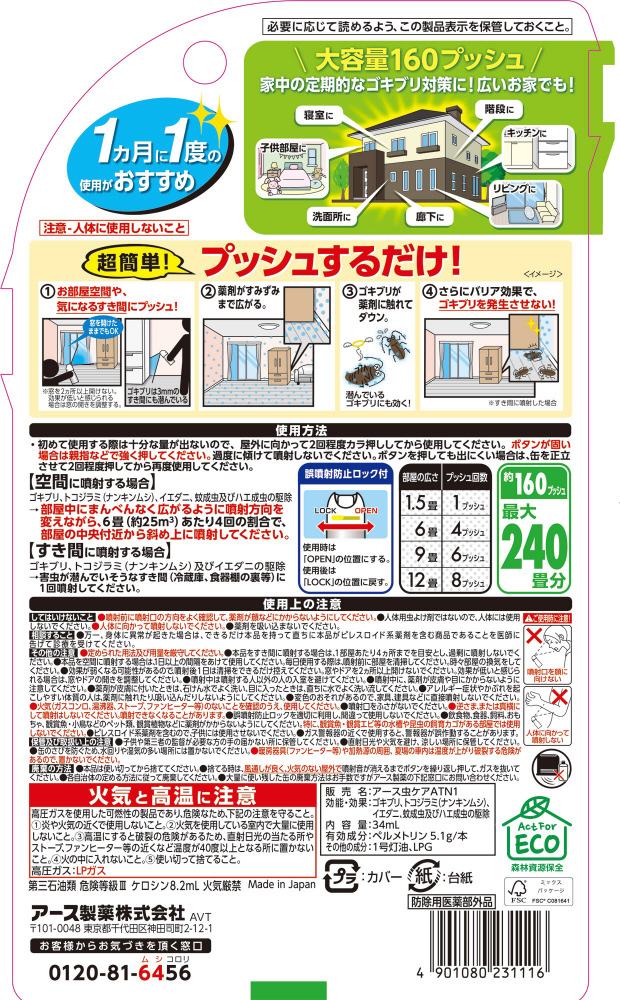 仕様1 効果・効能:ゴキブリ、トコジラミ(ナンキンムシ)、イエダニ、蚊成虫及びハエ成虫の駆除
