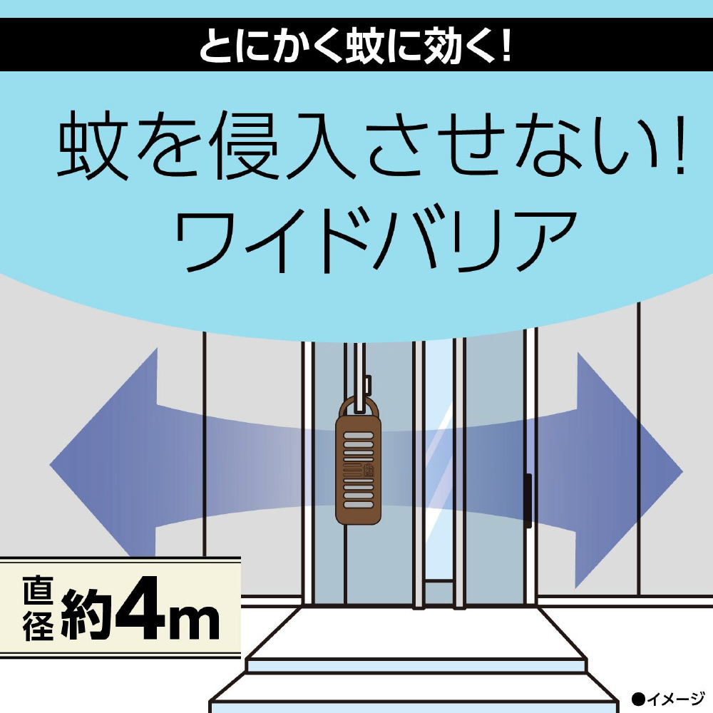 玄関などに吊り下げる、蚊よけプレート。玄関などの出入口付近に設置するだけで、屋内への蚊の侵入を阻止。屋外での忌避効果も。直径約4mの範囲で効果があります。