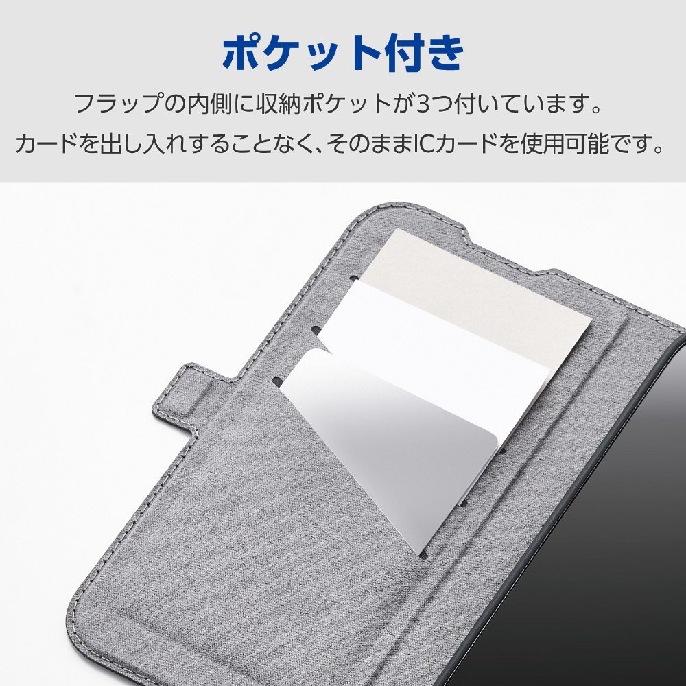 ■フラップの内側に、メモやカードなどが収納できるポケットが3つ付いています。カードを出し入れすることなく、そのままICカードを使用可能です。