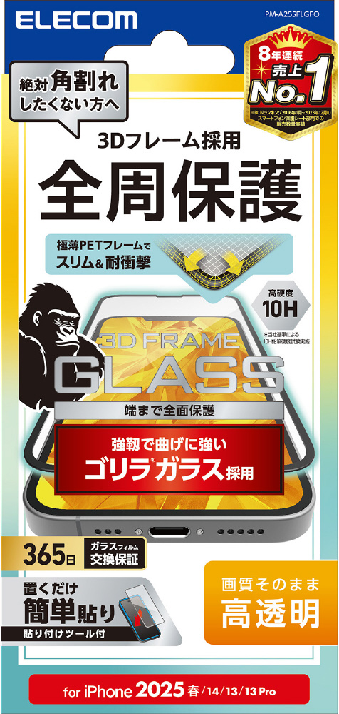 Gorilla(R)ガラスを採用し3D設計のPETフレームで角割れを防ぐ画面保護ガラスフィルムです。