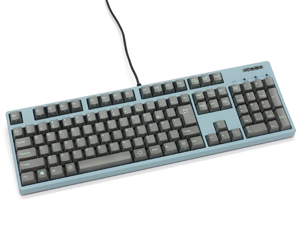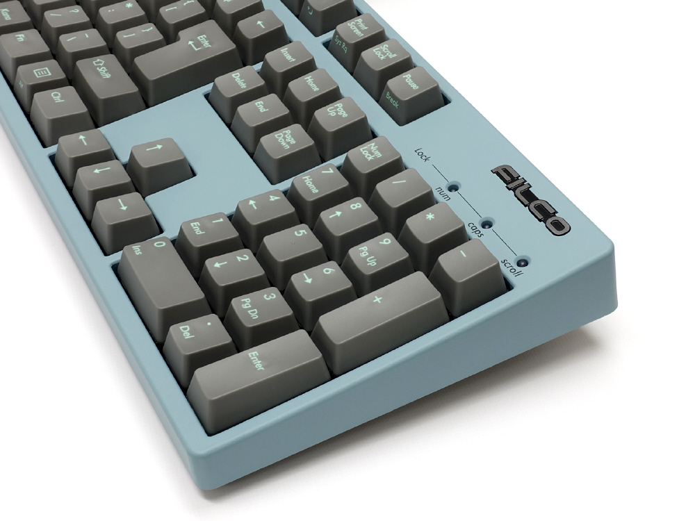 浅葱色のフレームにスカイグレー地のキーキャップを搭載したキーボード。