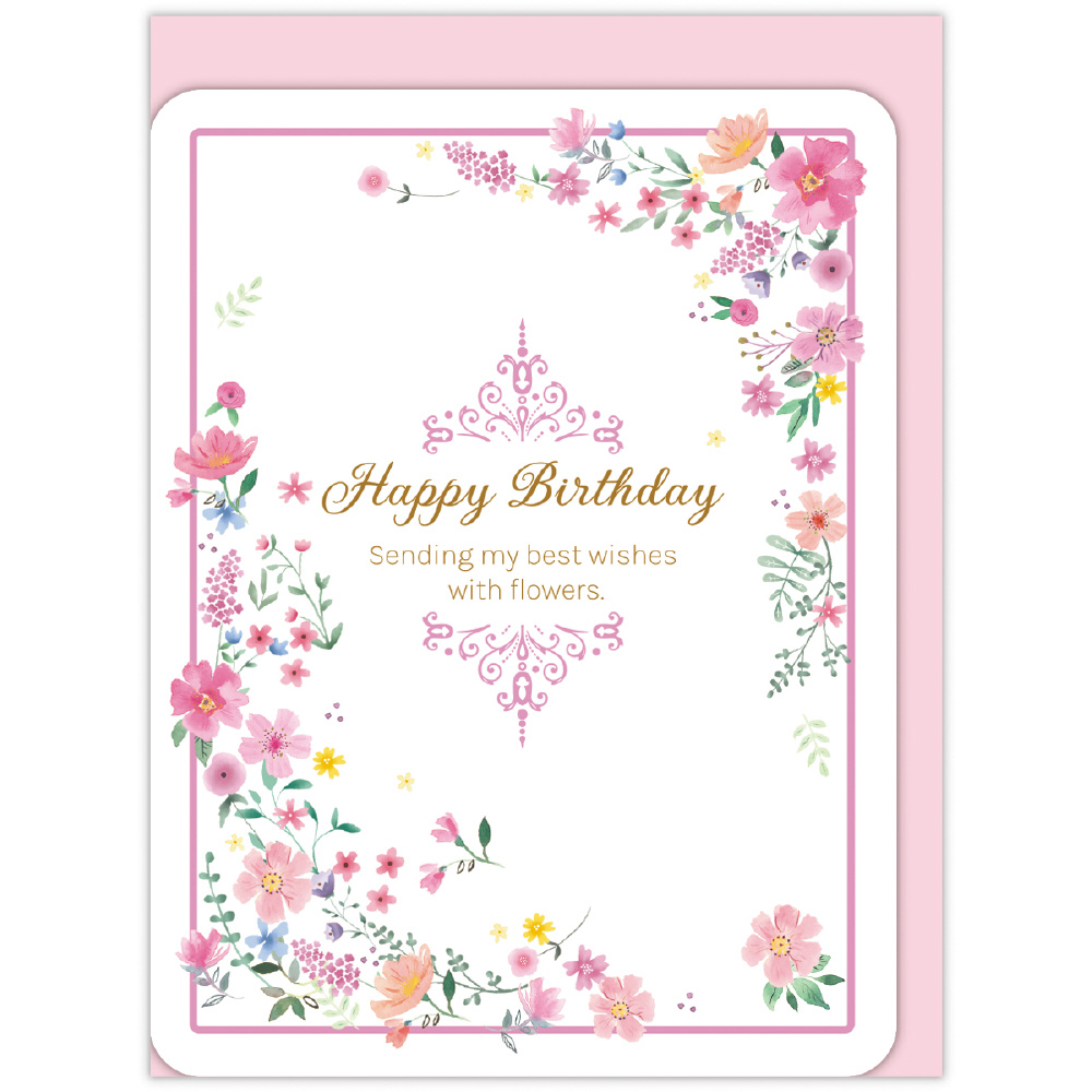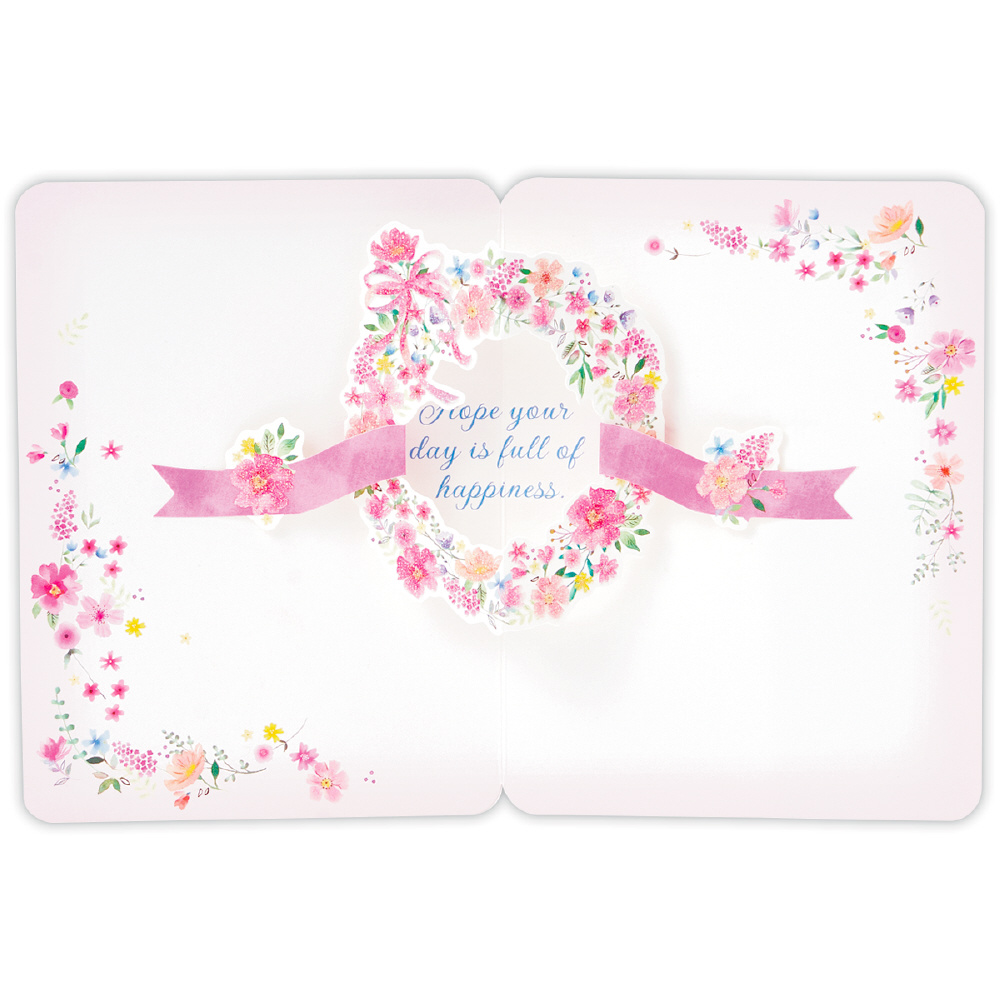 お相手を問わず贈りやすい定番人気の花柄デザイン。カードを開くとピンクの小花のリースがポップアップする華やかなバースデーカードです。
