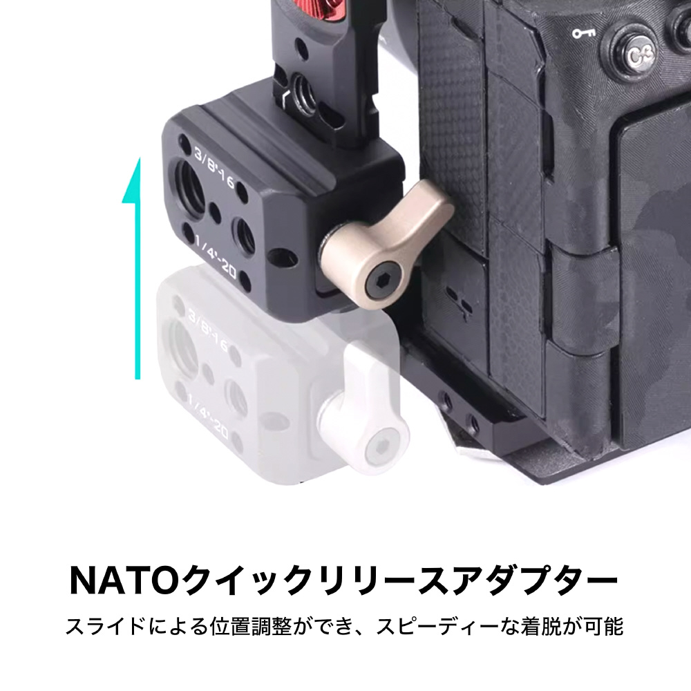 NATOクイックリリースアダプターはスライドによる位置調整ができ、スピーディーな着脱が可能。