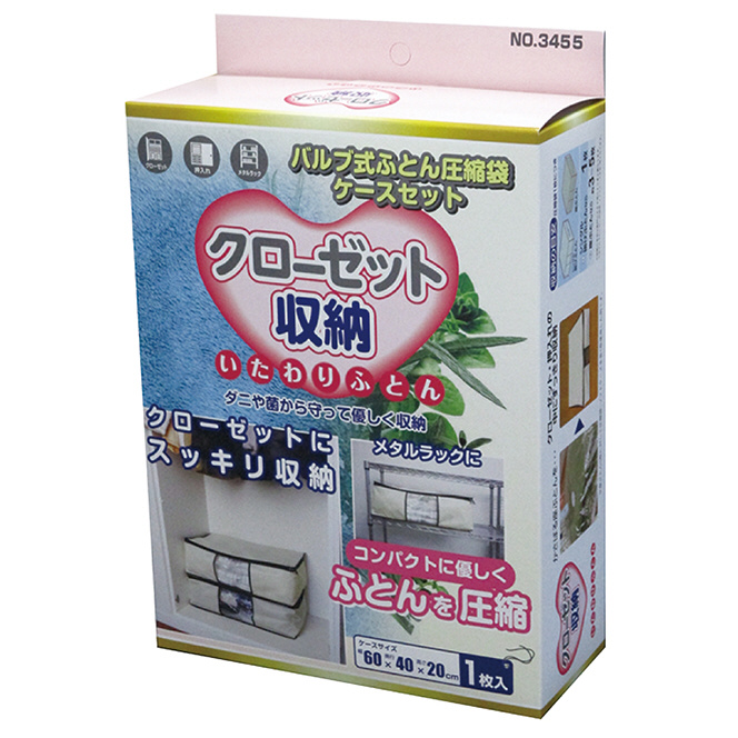 圧縮した布団を、専用ケース入れて収納できます。クローゼットやベット下などスッキリ収納可能です。