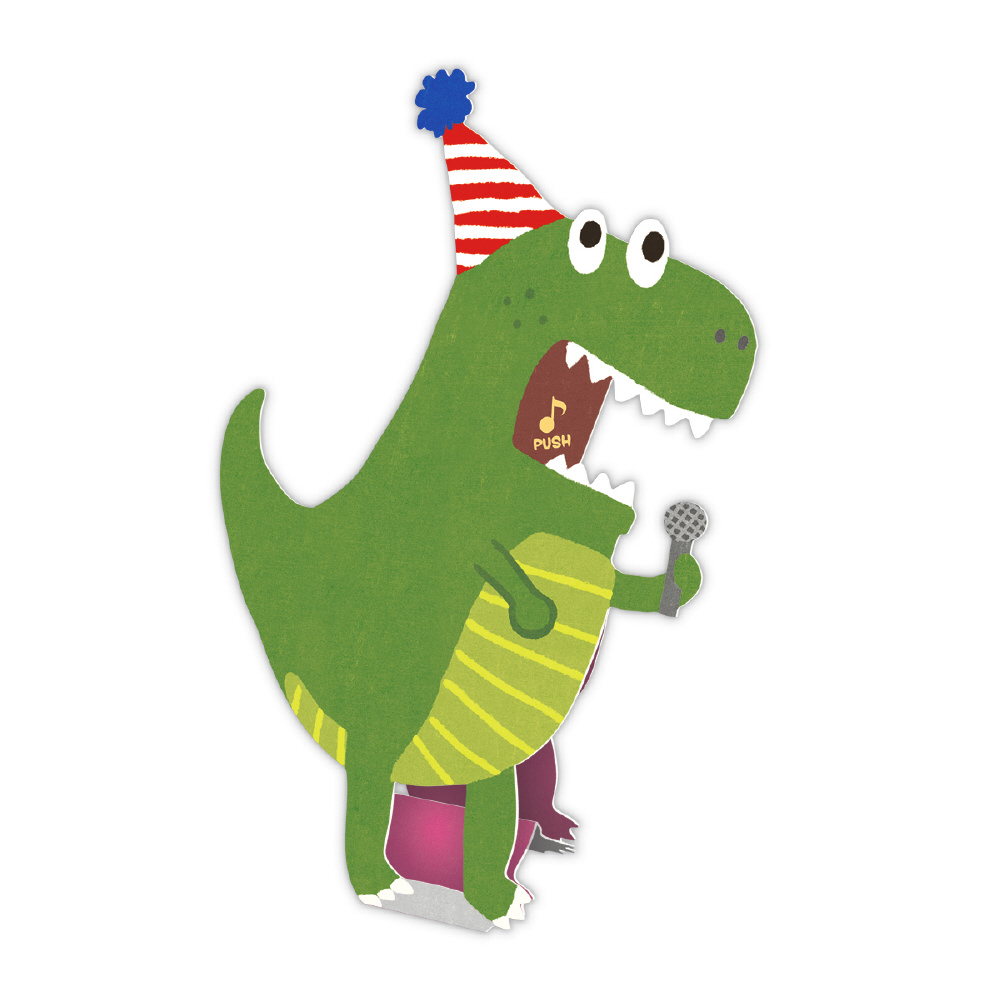 可愛い動物やキャラクターが自慢の歌声で誕生日をお祝いしてくれる「熱唱系アニマルズ」シリーズ。ダミ声が渋い恐竜がバースデーソングを熱唱します!