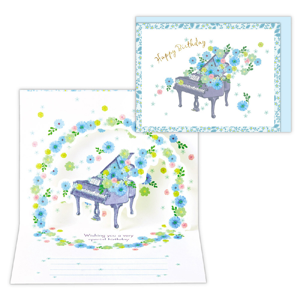 ブルー基調の花々とピアノがポップアップするエレガントなバースデーカード。ラメ加工・エンボス加工・箔加工を使用して華やかに仕上げました。