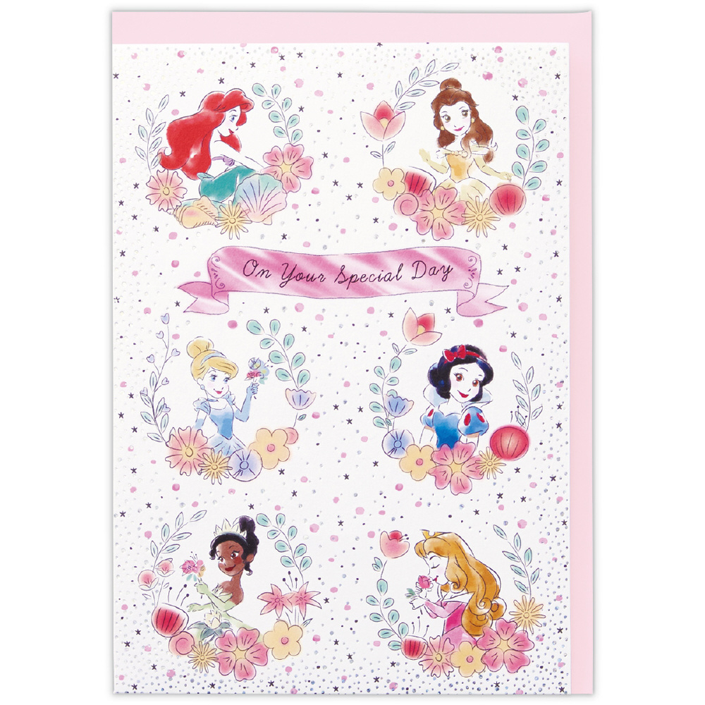 人気のディズニープリンセスたちが大きなケーキと一緒に誕生日をお祝いしてくれる華やかなカードです。ホログラム箔がきらきらと輝くロマンティックなデザインです。