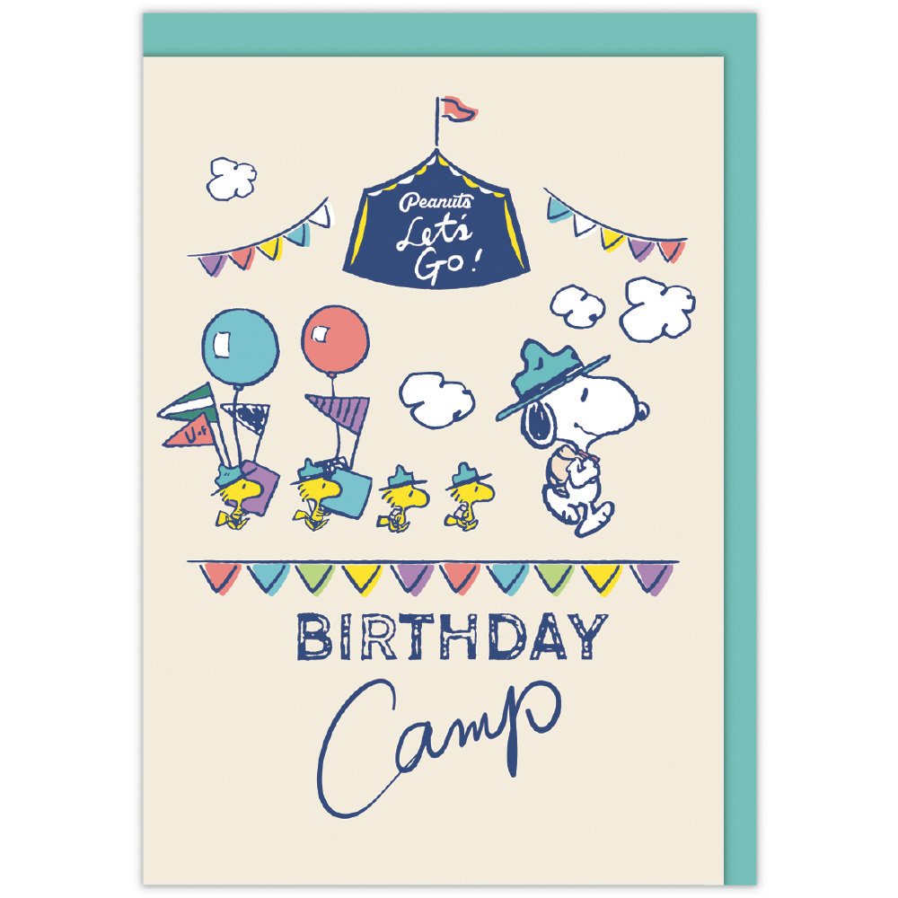 キャンプをモチーフにしたアウトドアなムード溢れるデザイン。カードを開くとテントを背にしたスヌーピーやウッドストックが誕生日をにぎやかにお祝いしてくれます。