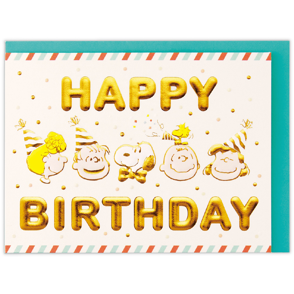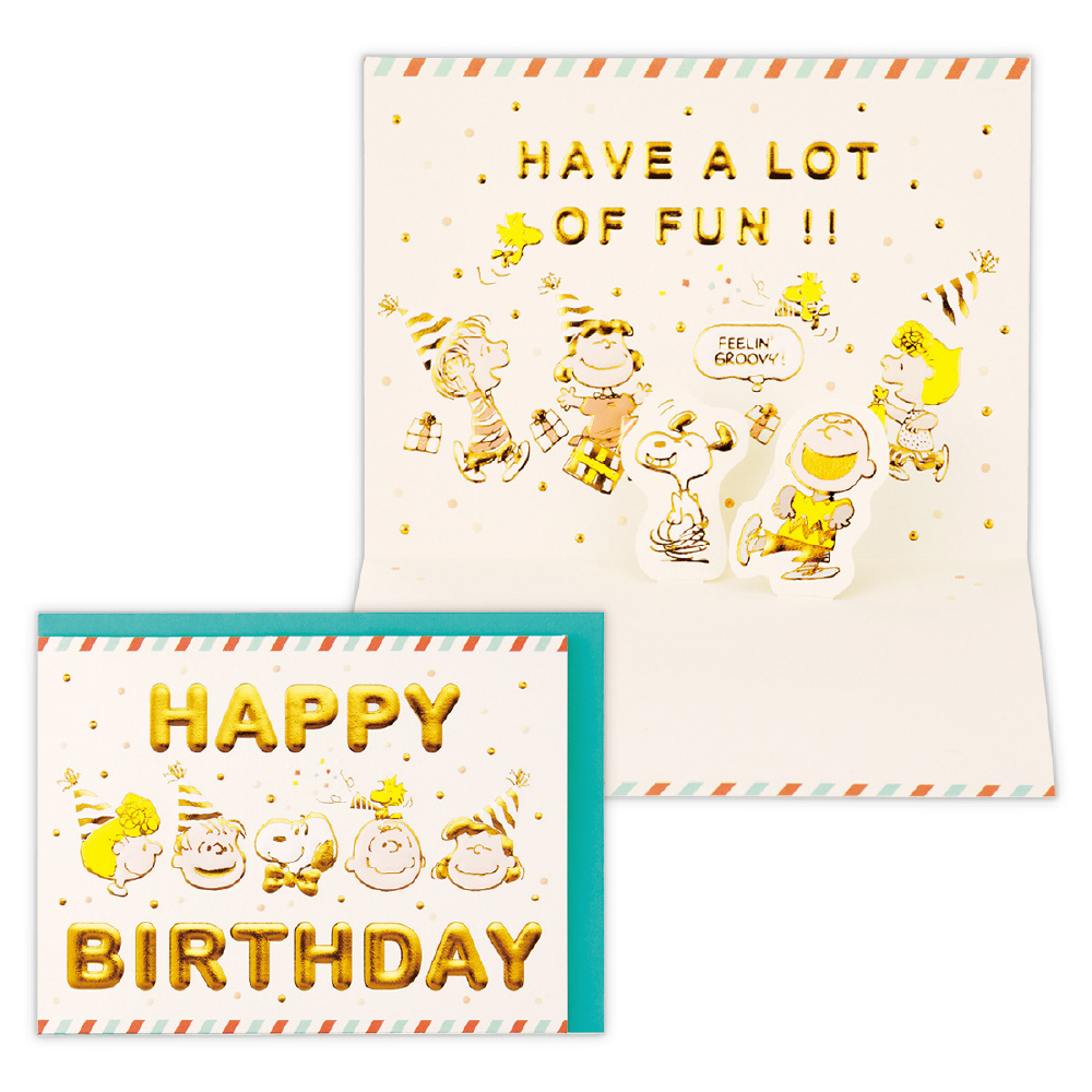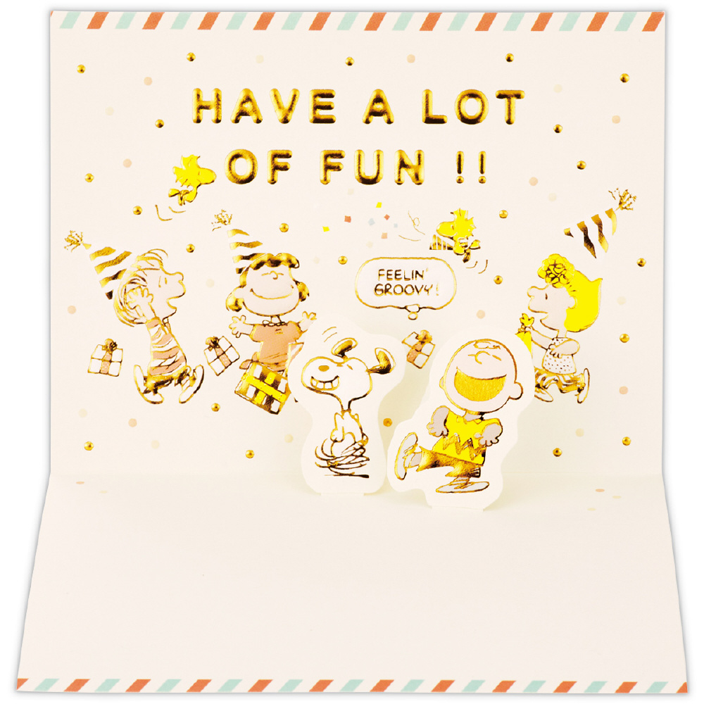 より立体的な3Dエンボスと箔加工を使用して、スヌーピーと仲間たちの顔を印象的に表現しました。カードを開くと楽しそうにはしゃぐキャラクターがポップアップ!
