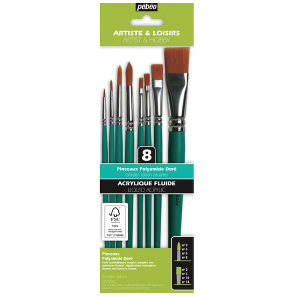 Pebeo クラフト化繊筆 平・丸筆8本セット(平2/4/10/18、丸0/4/6/8号)FSC認証 短軸