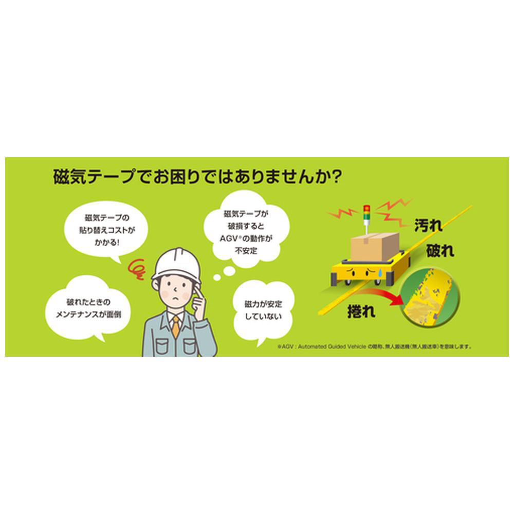 ■AGVの経路誘導には主に磁気テープが採用されていますが、テープの破れ・捲れなどの破損が生じやすく、AGVの誤動作の原因となって停止や不具合を起こすことがあります。