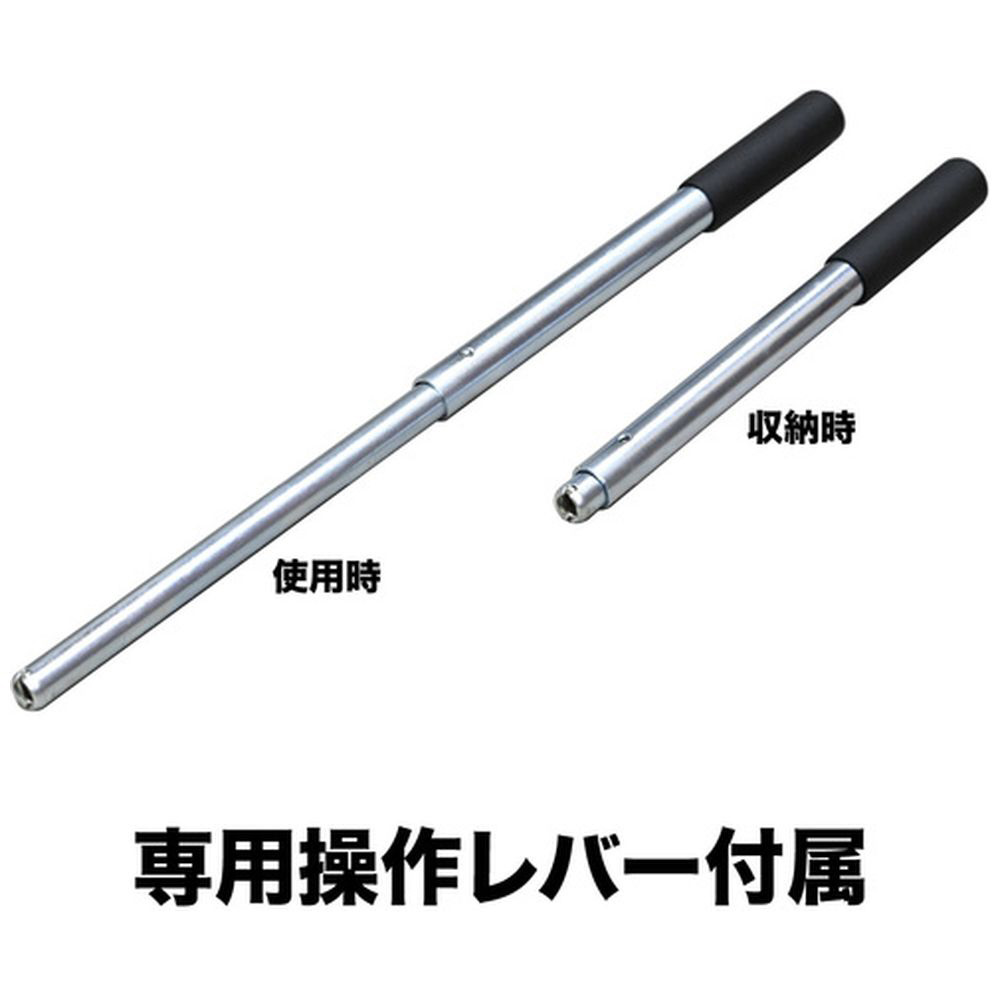 ■付属の操作レバーは剛性があり、グリップ付きのため、押し込む力がしっかりとジャッキに伝わります。また二本つなぎのロック機構があるため、繋ぎ目が外れる心配がありません。