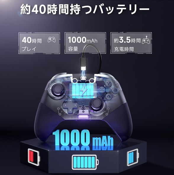 ゲームセッション中に中断される必要はありません。 当社のコントローラーには 1000mAh のアップグレードされたバッテリーが搭載されており、1 回の充電で最大 40 時間のゲームプレイが可能です。 バッテリー寿命が延長されたため、電力切れを心配することなく、より長くゲームに没頭できます。