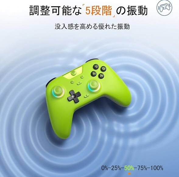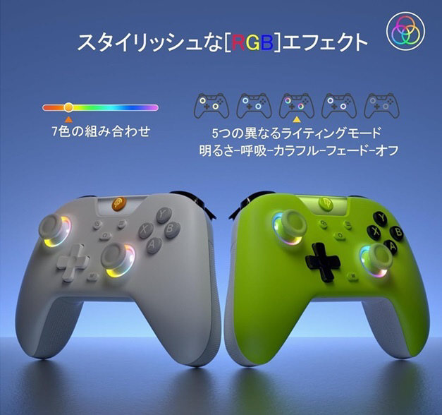 Switchコントローラー、ゲーミングコントローラー、7色ライト、5つのライトモード、5段階振動機能、ホールジョイスティック、ホールトリガー、750mAh大容量バッテリー搭載、PC/Switch/モバイル対応