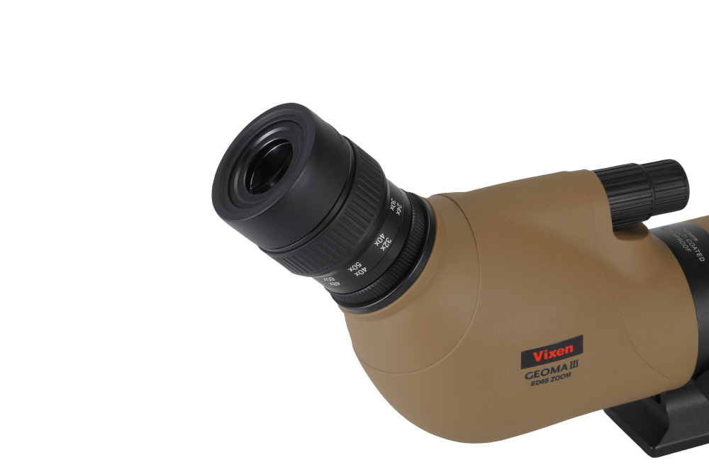 接眼レンズを目に強く押し当てなくても視野を見渡せるハイアイポイント設計(アイレリーフ20〜18mm)。さらに直径24mmの大口径接眼レンズ、のぞき口を指で回すと高さが変わるツイストアップ見口を採用するなど、長時間の観察でも目が疲れにくい設計となっています。裸眼はもちろん、メガネをかけたままでも広い視野を同時に見ることができます。