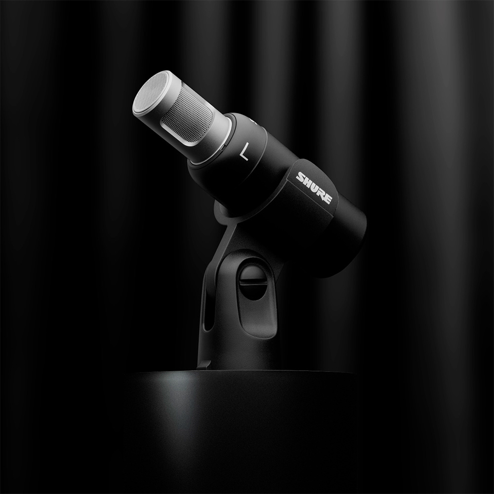定評のあるShure MV88+ および MV88モデルのテクノロジーを組み合わせたポケットサイズの MoveMic 88+は、4つの収音パターン(60度から135度まで幅調整可能なステレオ、モノカーディオイド、モノ双指向性、ミッドサイド)から1つを選ぶことで、収音方法をすばやく設定できます。