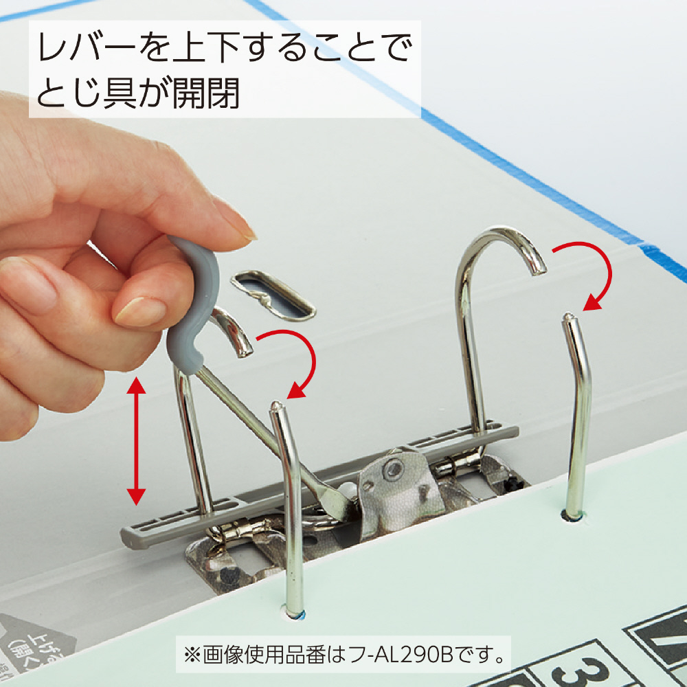 ●レバーを上下することで、とじ具が開閉。操作が分かりやすく、軽い力で開閉できます。また、書類が落ちにくい機構になっています。さらに、操作部には手当たりのよい樹脂を使用しています。
