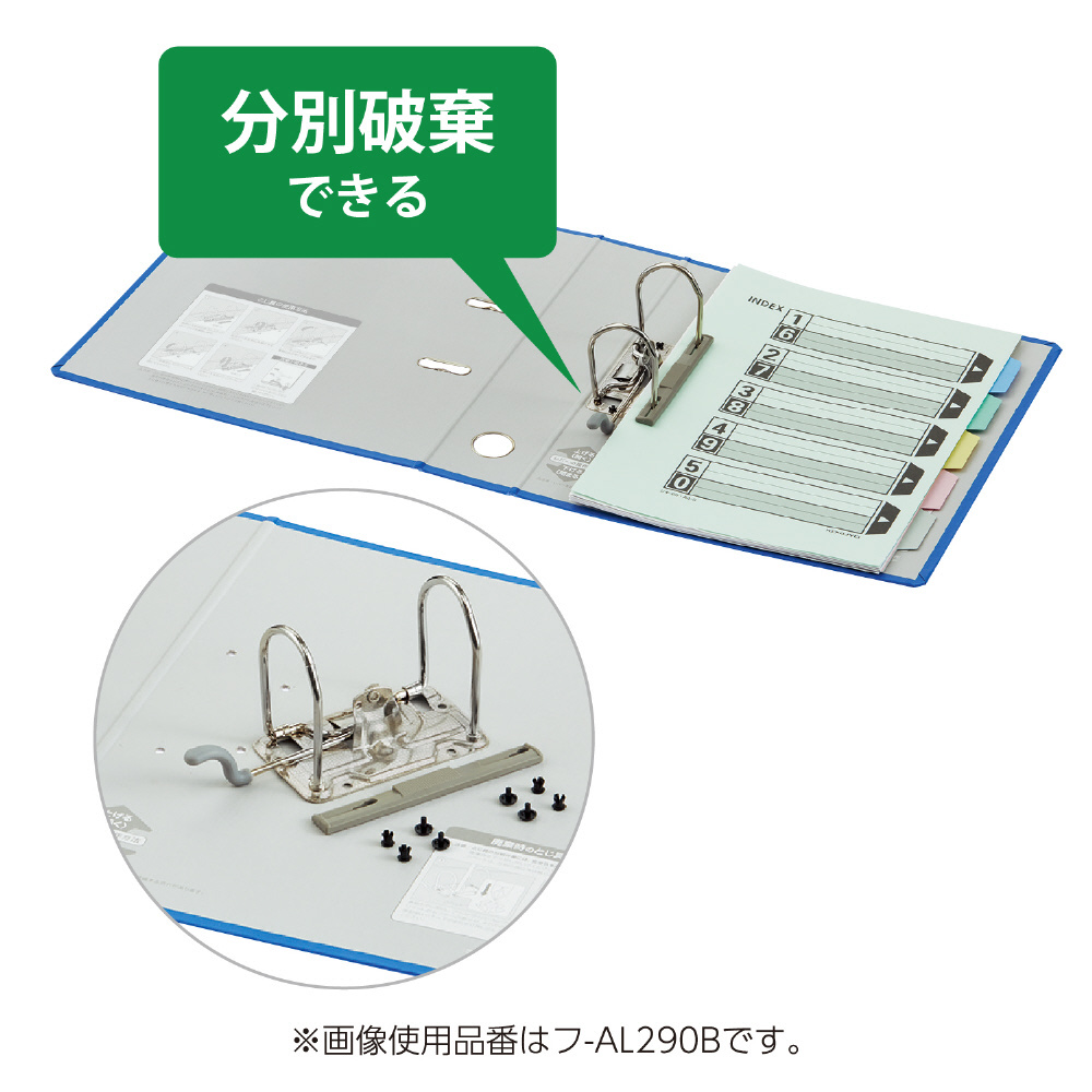 ●リング形状のとじ具なのでファイル文書の途中からでも簡単に書類が取り出せます。抜き差し頻度の多い活用中の書類のファイリングに最適です。