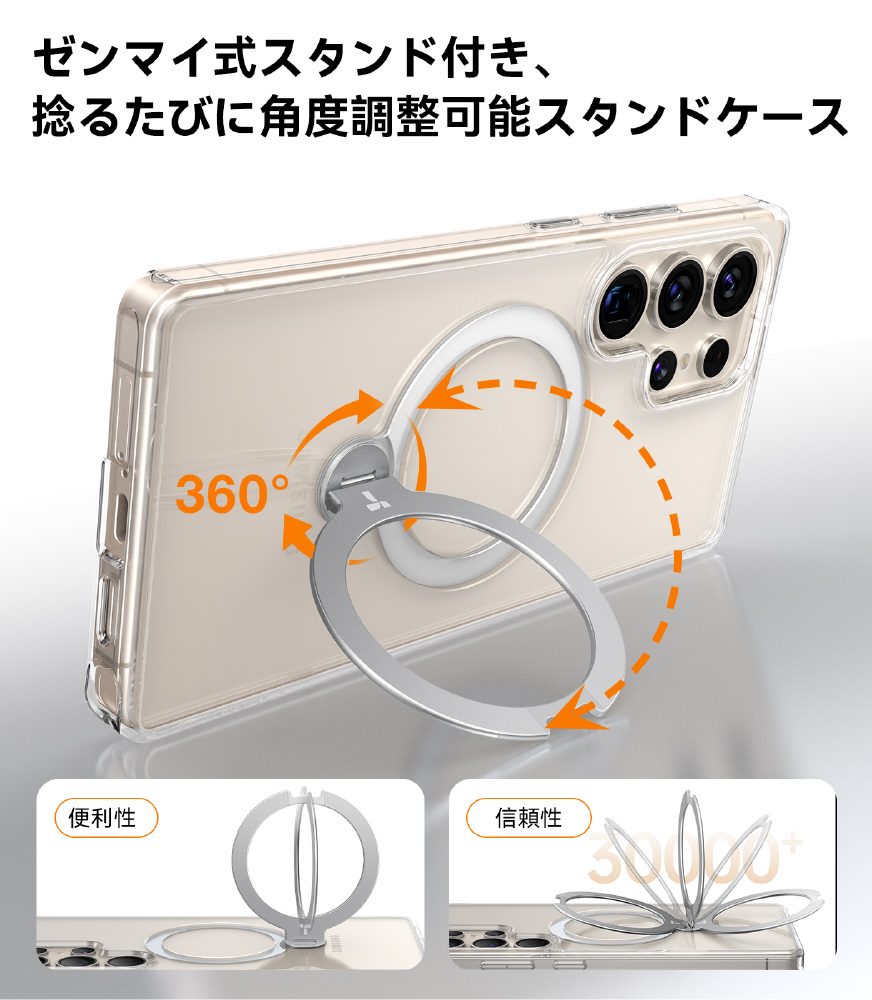 ・無限回転スタンド:スマホを15°?85°の水平角度、0°?85°の垂直角度で支えられる。