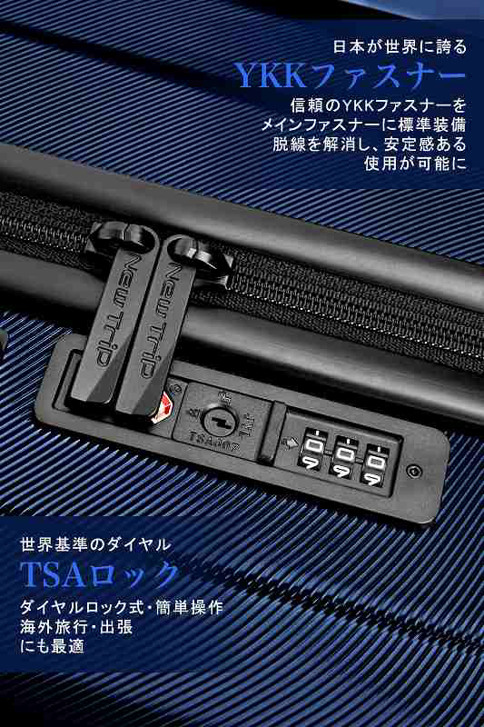 ABS樹脂は軽くて弾力性と割れに強く、PC(ポリカーボネート)樹脂は耐衝撃性・断熱材に優れる、両素材を混合した耐久性が高いハードタイプの高品質ボディを実現しています。また、日本が世界に誇るYKKファスナーをメインファスナーに標準装備。ファスナータイプのスーツケースによくあるファスナーの不具合(ファスナー脱線や開き)を解消し、長期にわたり安定した使用感が可能となりました。