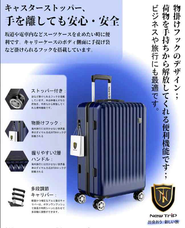360度回転可能の8輪ダブルキャスターは、静音と耐久性抜群で、凸凹道でもスムーズに走ることができます。また、ストッパーが付いているため、坂道や電車内などスーツケースを止めたい時に便利です。キャリーケースのボディ側面に手提げ袋など掛けられるフックを搭載しています。外出中増えがちな荷物を、手持ちから解放してくれる便利機能です。