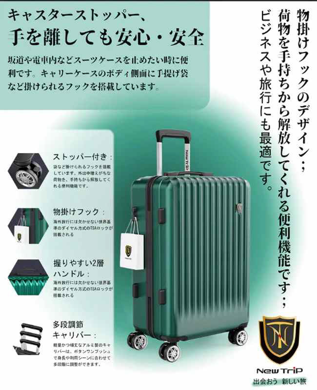 360度回転可能の8輪ダブルキャスターは、静音と耐久性抜群で、凸凹道でもスムーズに走ることができます。また、ストッパーが付いているため、坂道や電車内などスーツケースを止めたい時に便利です。キャリーケースのボディ側面に手提げ袋など掛けられるフックを搭載しています。外出中増えがちな荷物を、手持ちから解放してくれる便利機能です。